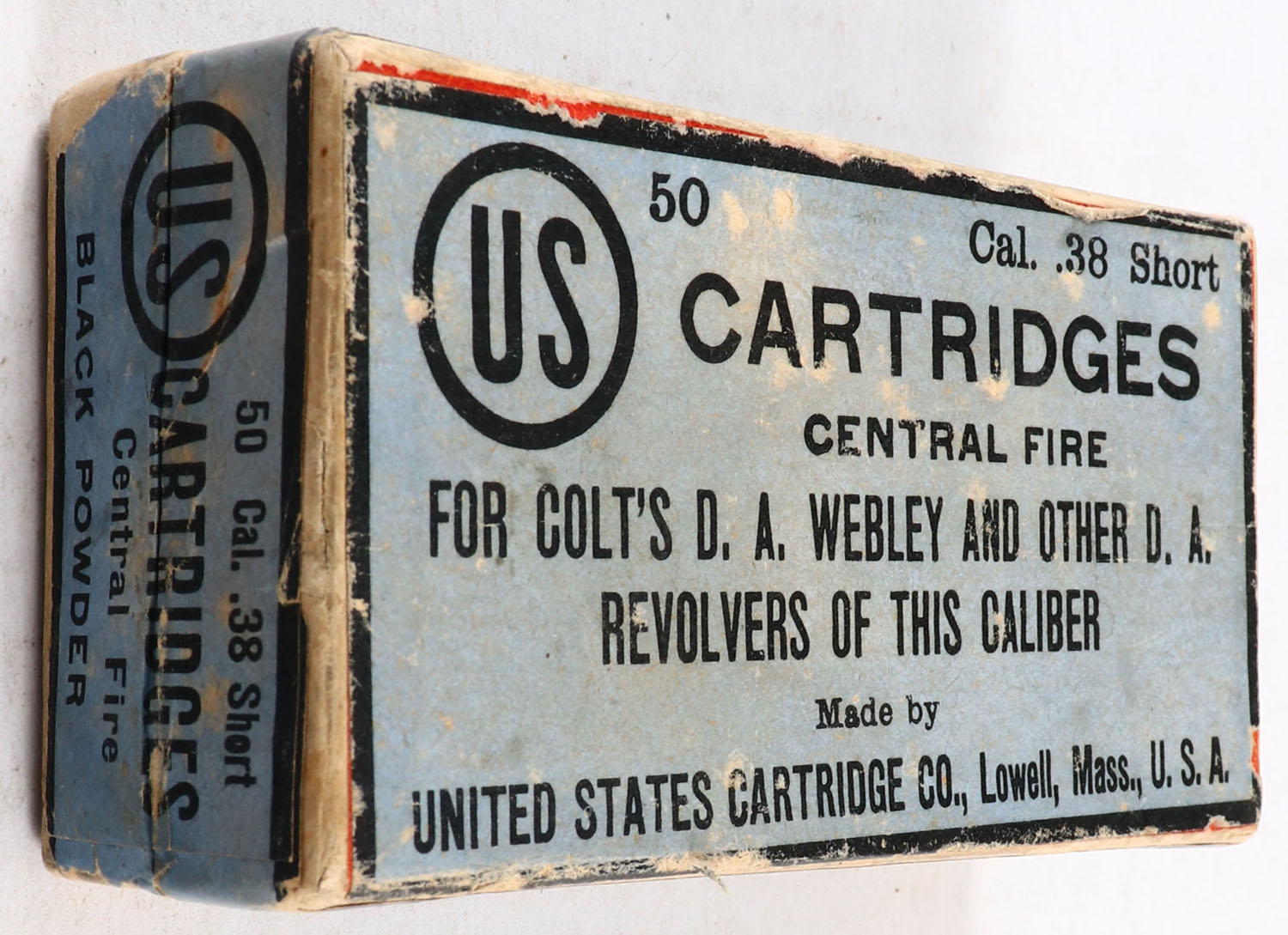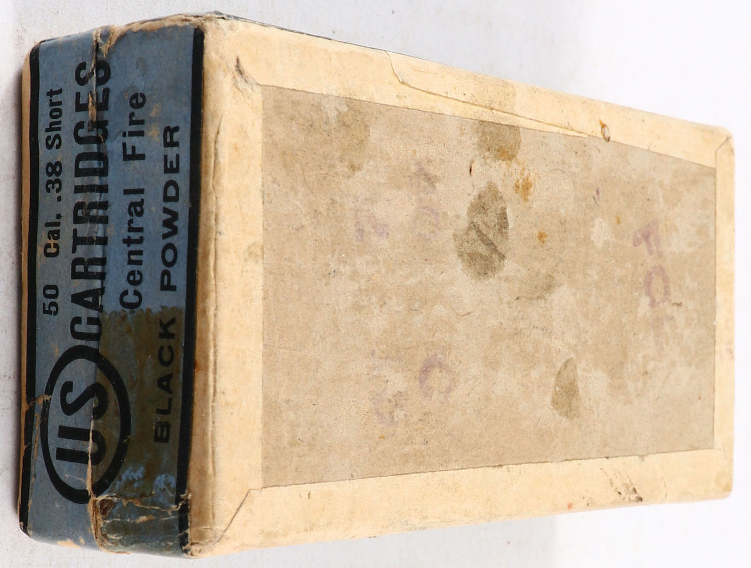 U.S., Central Fire Cartridges, .38 Short Colt, Black Powder, FULL & SEALED, 2pc. Buff box with blue top & side sealing labels, box is solid with excellent color, some shelf wear, minor edge & corner wear, side sealing label is 99% intact. Grade: Very Good ++ - Value: 40 to 120
