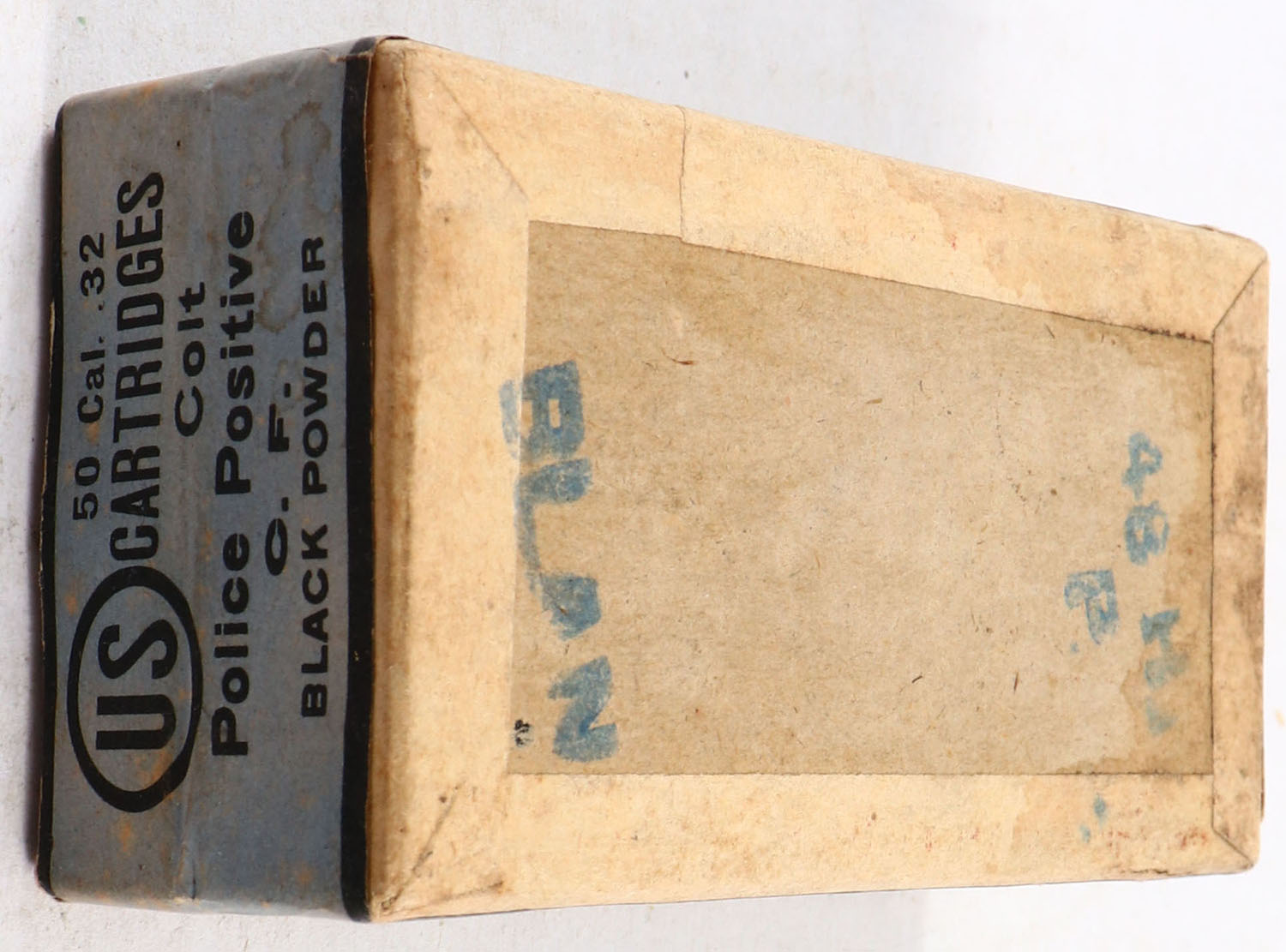 U.S., Central Fire Cartridges, .32 Colt Police Positive, FULL & SEALED, 2pc. Buff box with blue top & side sealing labels, box is solid with very good color, some color fading & age soiling, very minor corner wear, edges are mostly crisp, labels are intact. Grade: Very Good + - Value: 30 to 90