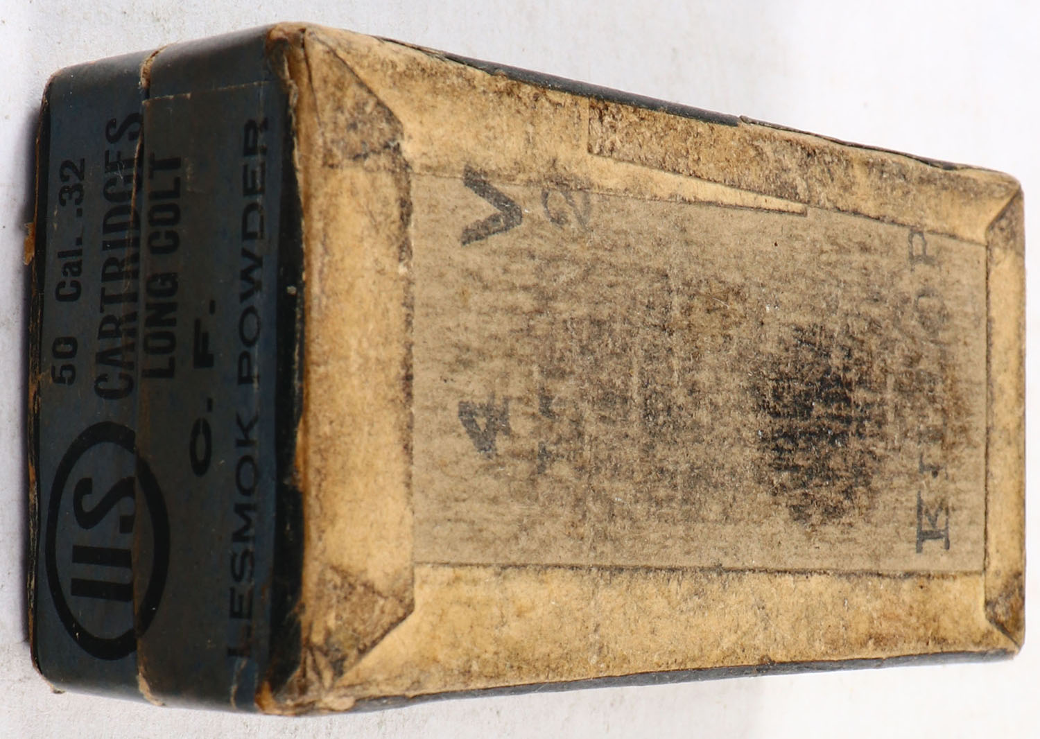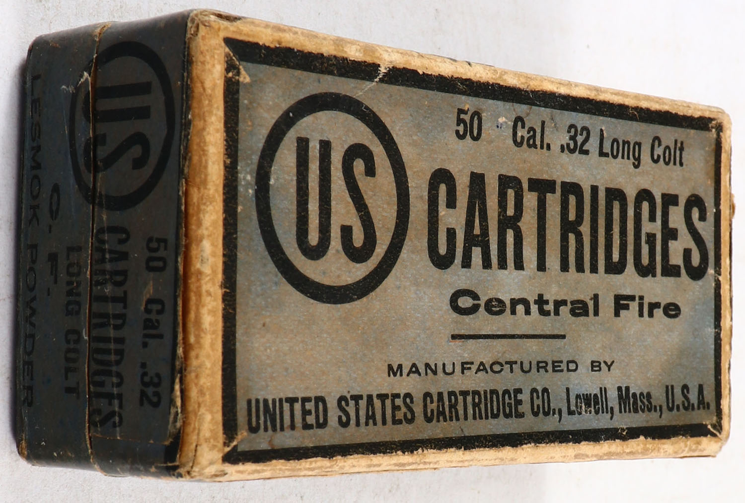 U.S., Central Fire Cartridges, .32 Long Colt, Lesmok Powder, Full, 2pc. Buff box with blue top & side sealing labels, box is solid with good to very good color, age soiling, some edge & corner wear, labels are intact, ammo is good to very good. Grade: Very Good - Value: 16 to 60