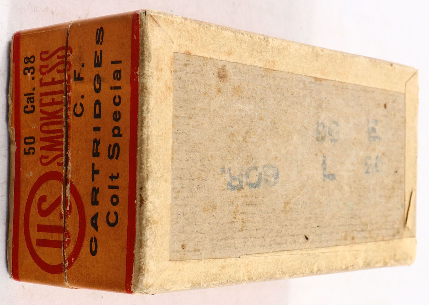 U.S., Smokeless Central Fire Cartridges, .38 Colt Special, Full of mixed H/S, 2pc. Buff box with orange & red labels, box is solid with very good to excellent color, some age soiling & corner wear, minor edge wear, labels are intact, ammo is excellent. Grade: Very Good + - Value: 16 to 60
