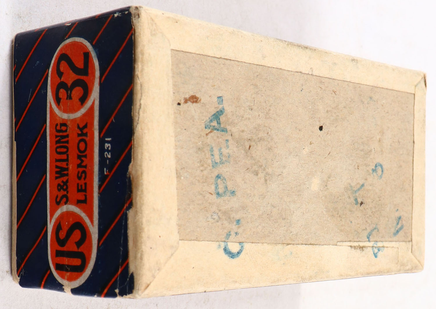 U.S., Lesmok Central Fire, .32 Smith & Wesson Long, FULL & SEALED, 2pc. Buff box with blue & orange labels, box is near mint with minty color, only has very minor shelf wear, corners are sharp, edges are crisp, labels are intact. Grade: Excellent ++ - Value: 30 to 90