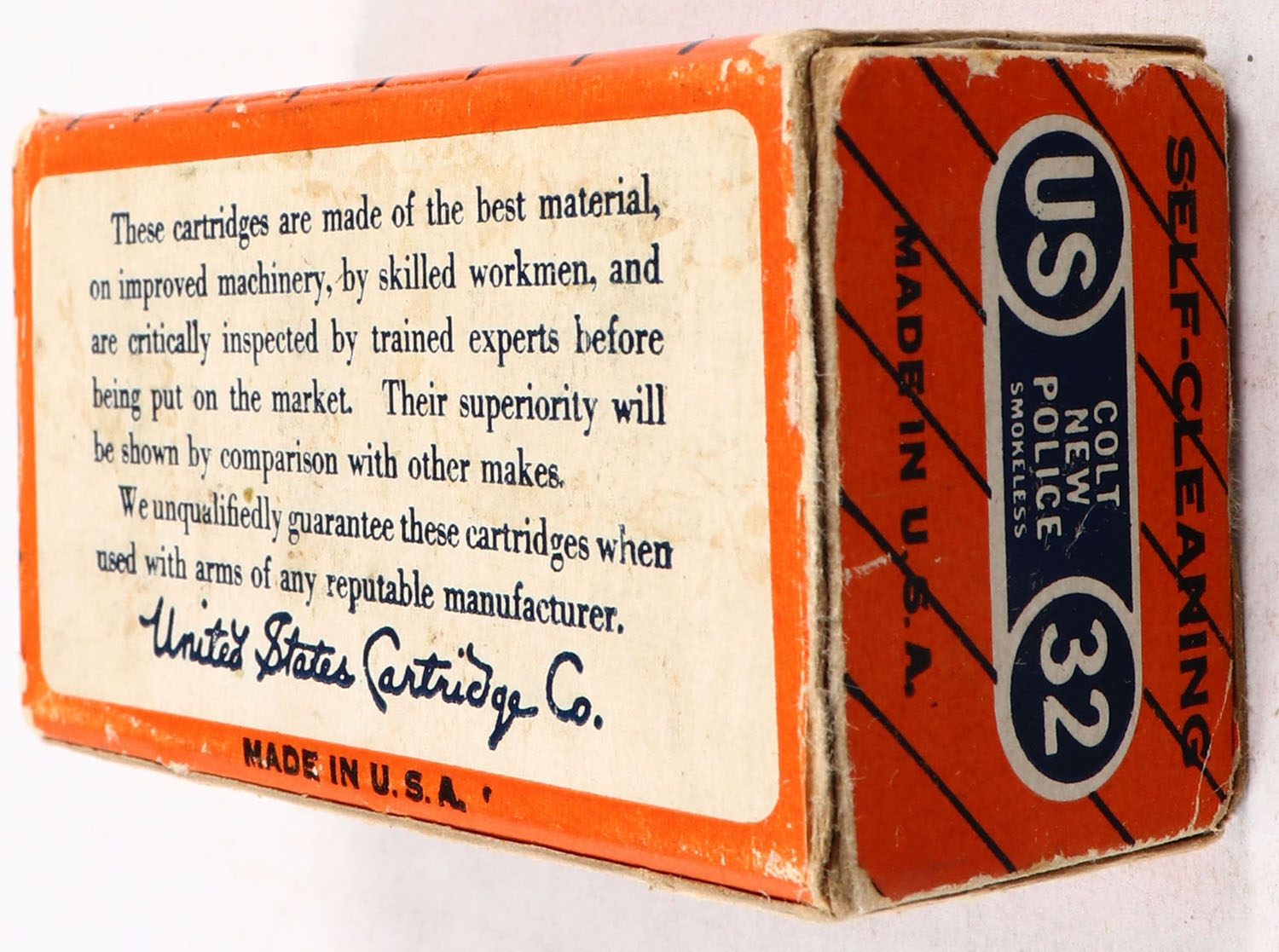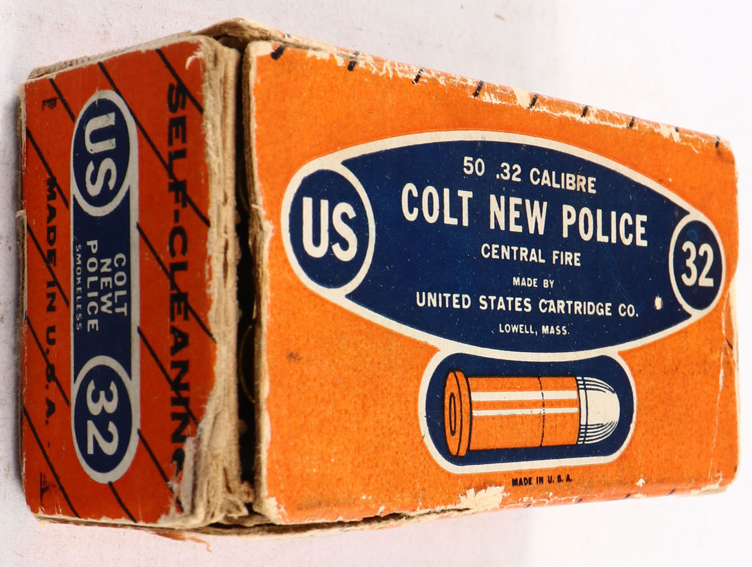 U.S., Central Fire, .32 Colt New Police, Smokeless, Full, 1pc. Orange & blue box, left end is torn, excellent color, very minor color fading, partial seam split to top front edge, edge & corner wear, right end flap is solid, ammo is excellent. Grade: Very Good - Value: 10 to 50