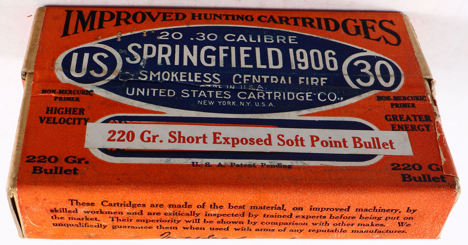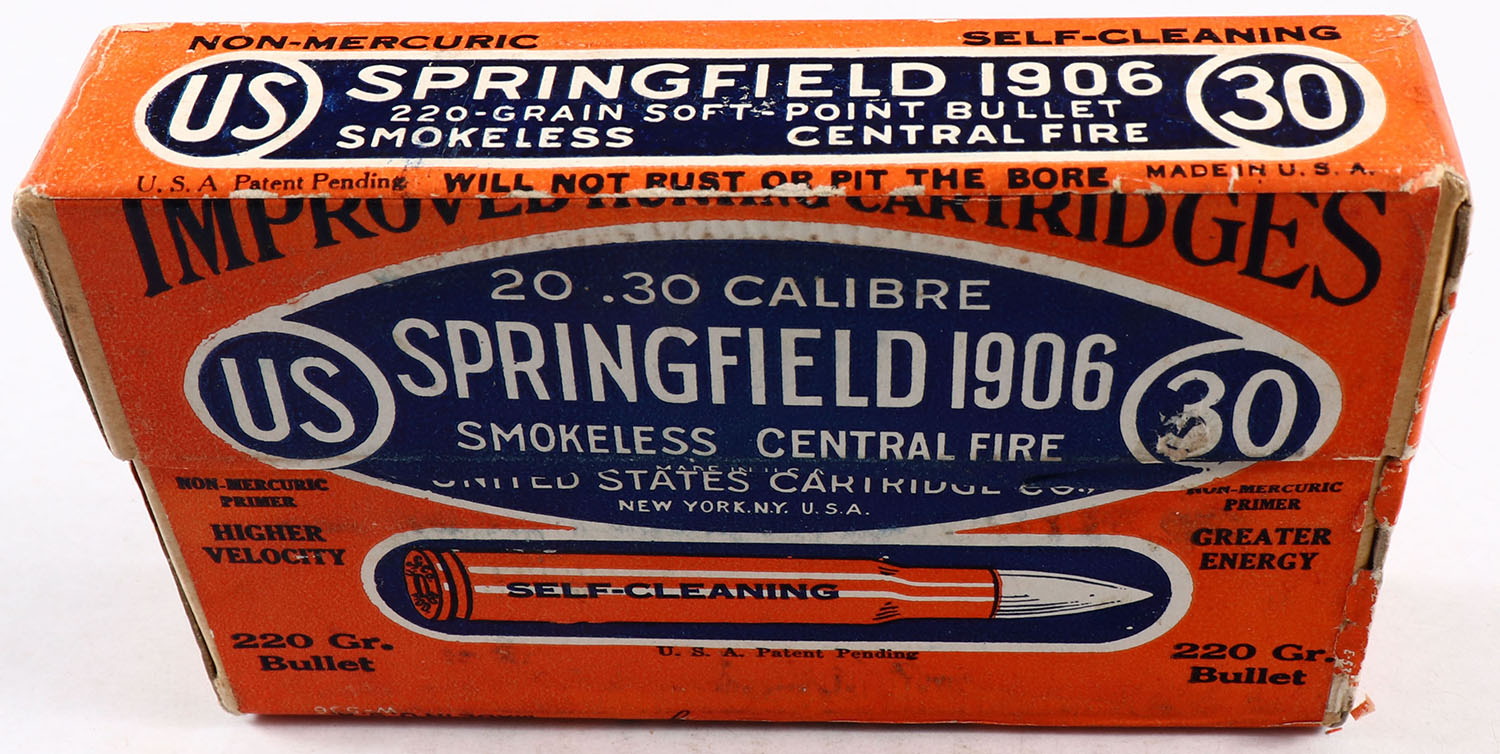 U.S., Improved Cartridges, .30 Springfield 1906 (.30-06), 220 Gr. Bullet, FULL & SEALED, 2pc. Buff box with orange & blue labels, box is solid with excellent color, very minor shelf & corner wear, edges are crisp, labels are intact. Grade: Excellent + - Value: 20 to 60