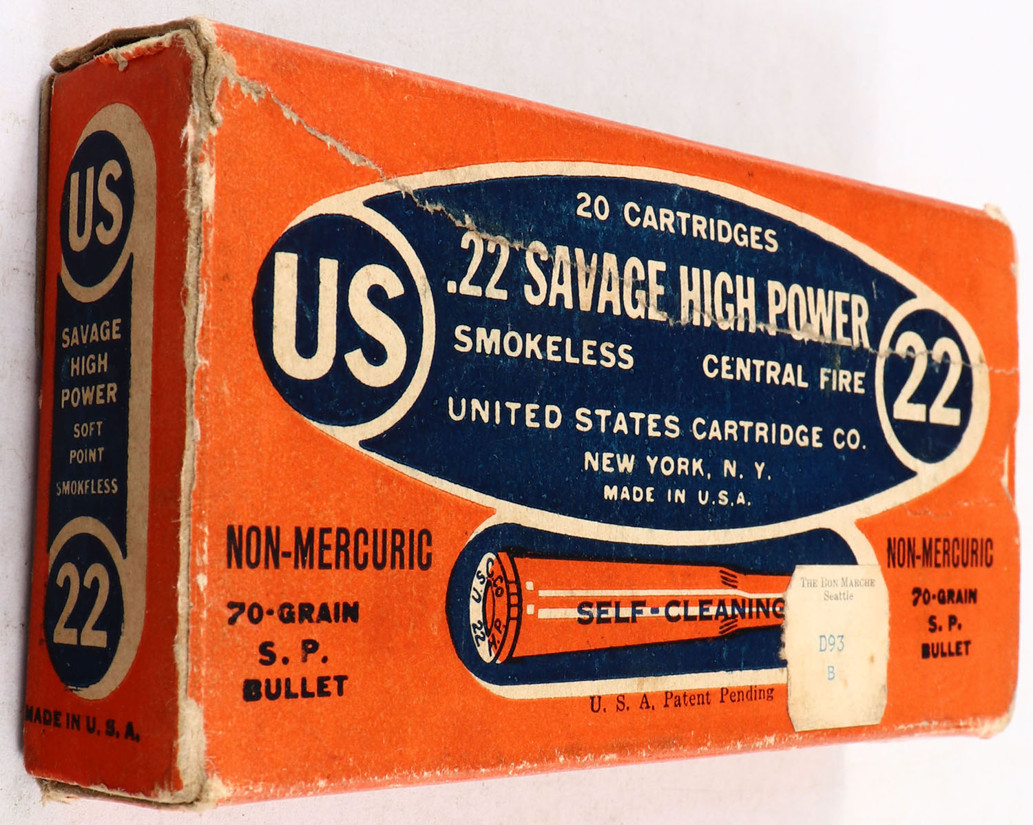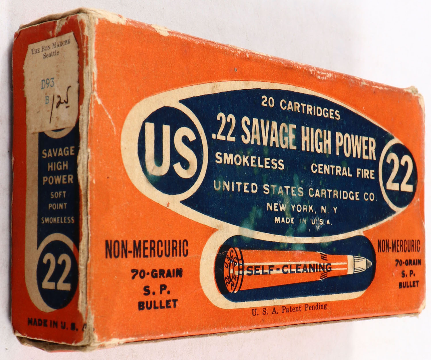 U.S., Smokeless Central Fire, .22 Savage High Power, 70 Grain Soft Point Bullet, Partial 18rds., 1pc. Orange blue & white box, box is solid with excellent color, minor age soiling, some edge & corner wear, end flaps are solid, ammo is excellent. Grade: Very Good + - Value: 20 to 60