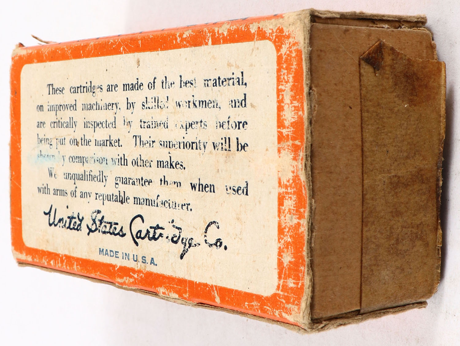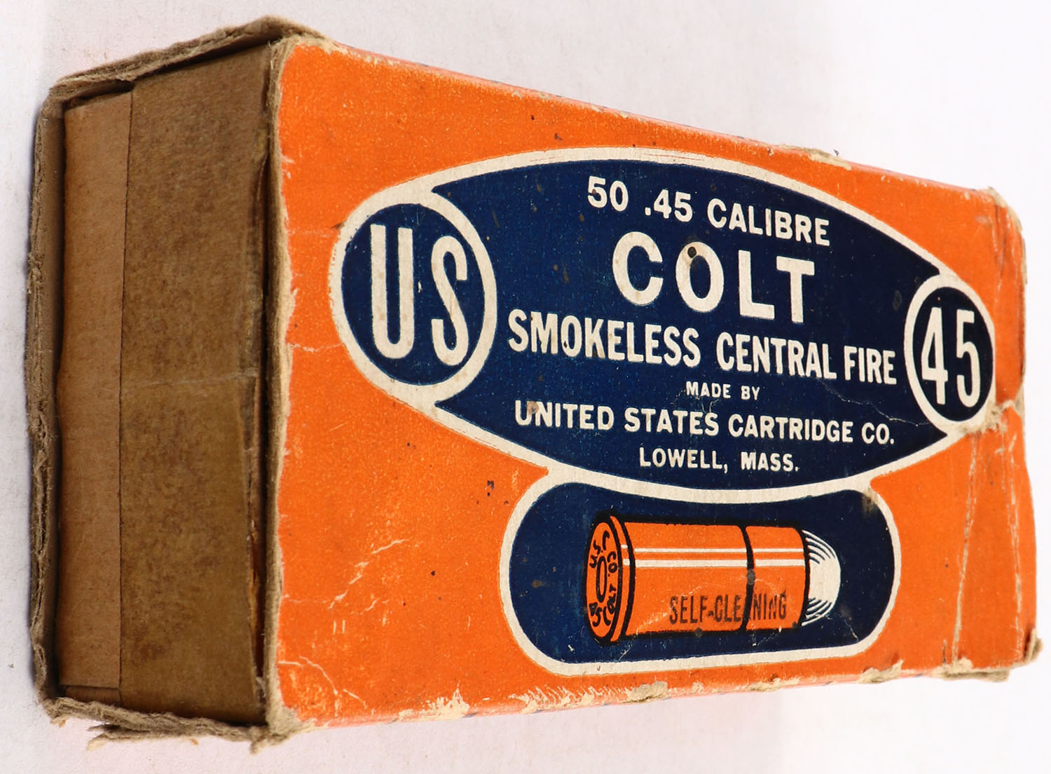 U.S., Smokeless Central Fire, .45 Colt, Partial 38rds. 1pc. Orange blue & white box, box is missing both end flaps, excellent color, very minor shelf wear, corner wear, some edge wear, ammo is very good to excellent. Grade: Good + - Value: 16 to 60