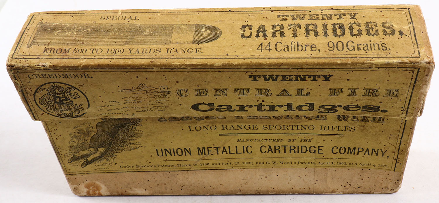 U.M.C., Central Fire Cartridges, .44 Calibre, 90 Grains, Empty, 2pc. Buff box with yellow label, box is solid with very good color, some age soiling & staining, some corner wear, very minor edge wear, label is intact. Grade: Very Good + - Value: 20 to 60