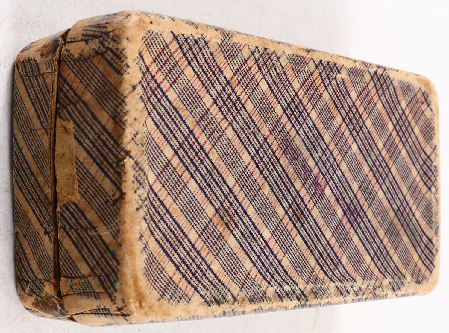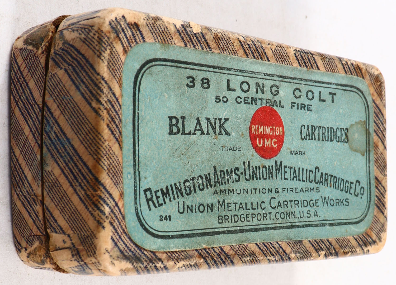 REM-UMC, Central Fire Blank Cartridges, .38 Long Colt, Full, 2pc. Purple fabric box with blue top label, box is solid with very good color, very minor age soiling, stain on top, minor corner wear, edges are mostly crisp, side sealing label is gone, top label is intact, ammo is very good to excellent. Grade: Very Good + - Value: 10 to 50
