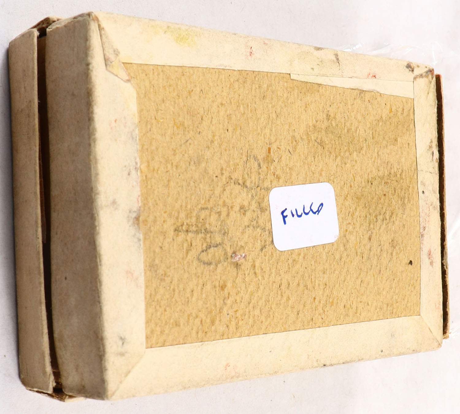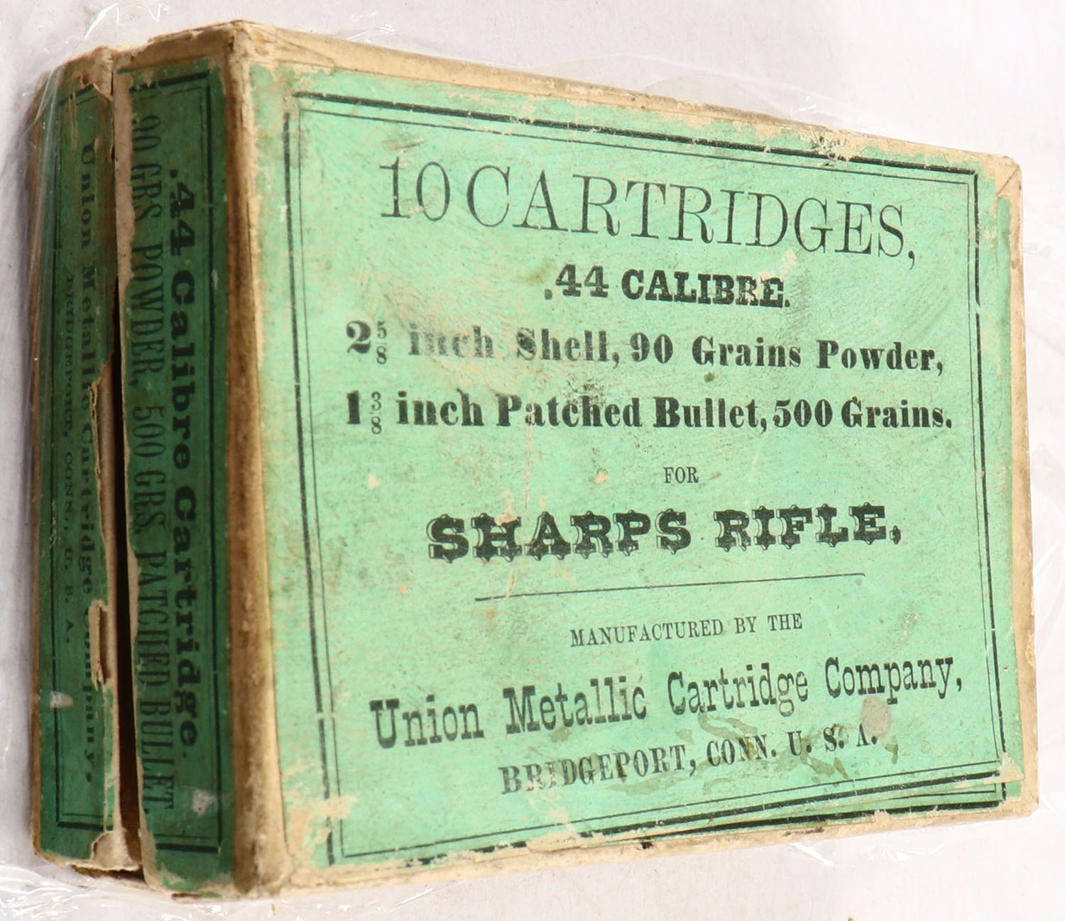 UMC, Sharps Rifle, .44 Calibre, 2 5/8 inch Shell, 90 Grains Powder, 1 3/8 inch Patched Bullet, 500 Grains, Full, 2pc. Buff box with green label, entire left end is torn, very good color, some age soiling & color fading, minor shelf wear, some corner wear, very minor edge wear, label is intact, ammo is excellent. Grade: Good ++ - Value: 200 to 600