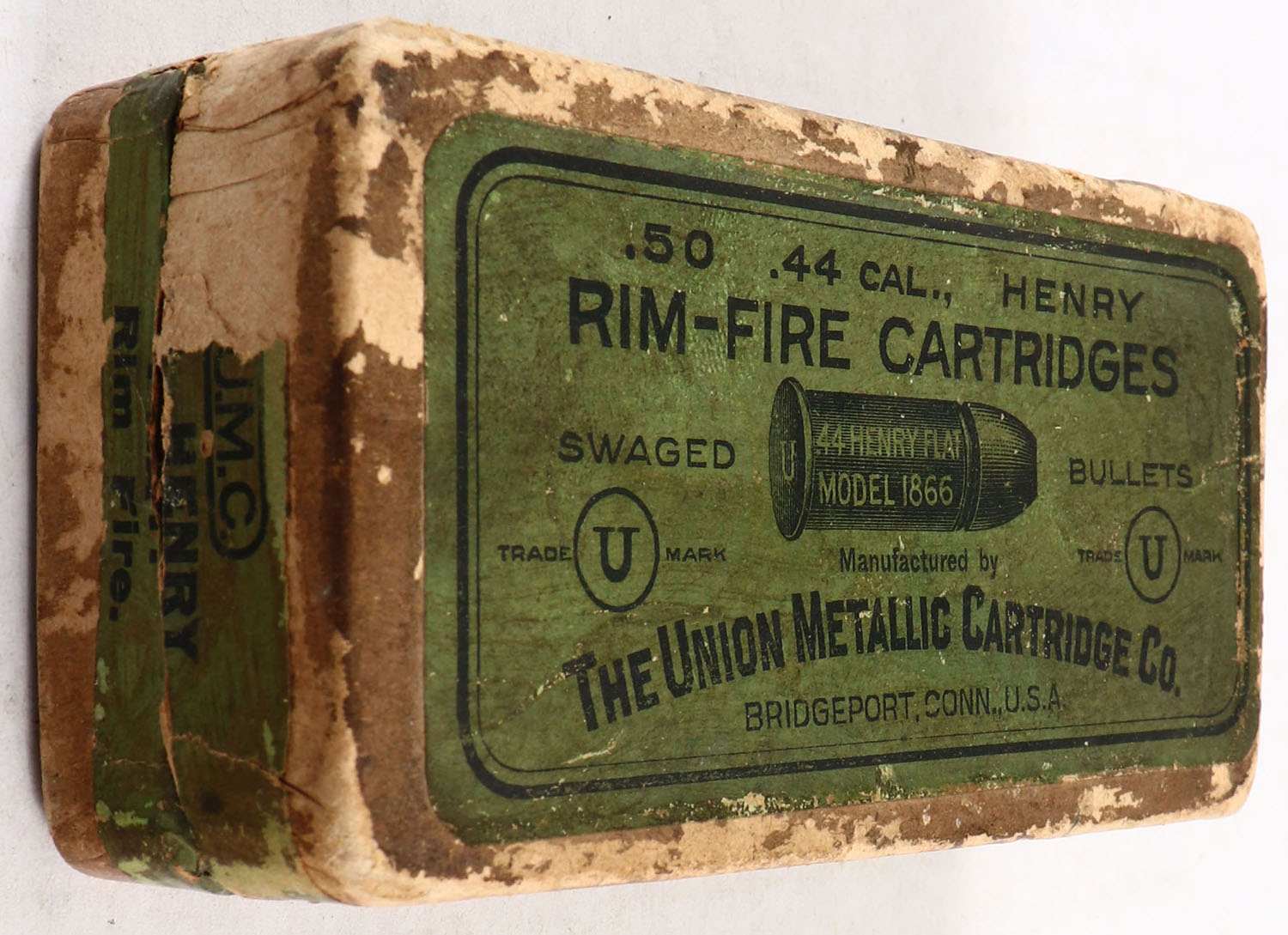 UMC, Rim-Fire Cartridges, .44 Henry Flat, Swaged Bullets, Empty, 2pc. Buff box with green top & side sealing labels, box is solid with good to very good color, age soiling, shelf wear, some edge & corner wear, side sealing label is 80% intact. Grade: Good - Value: 10 to 50