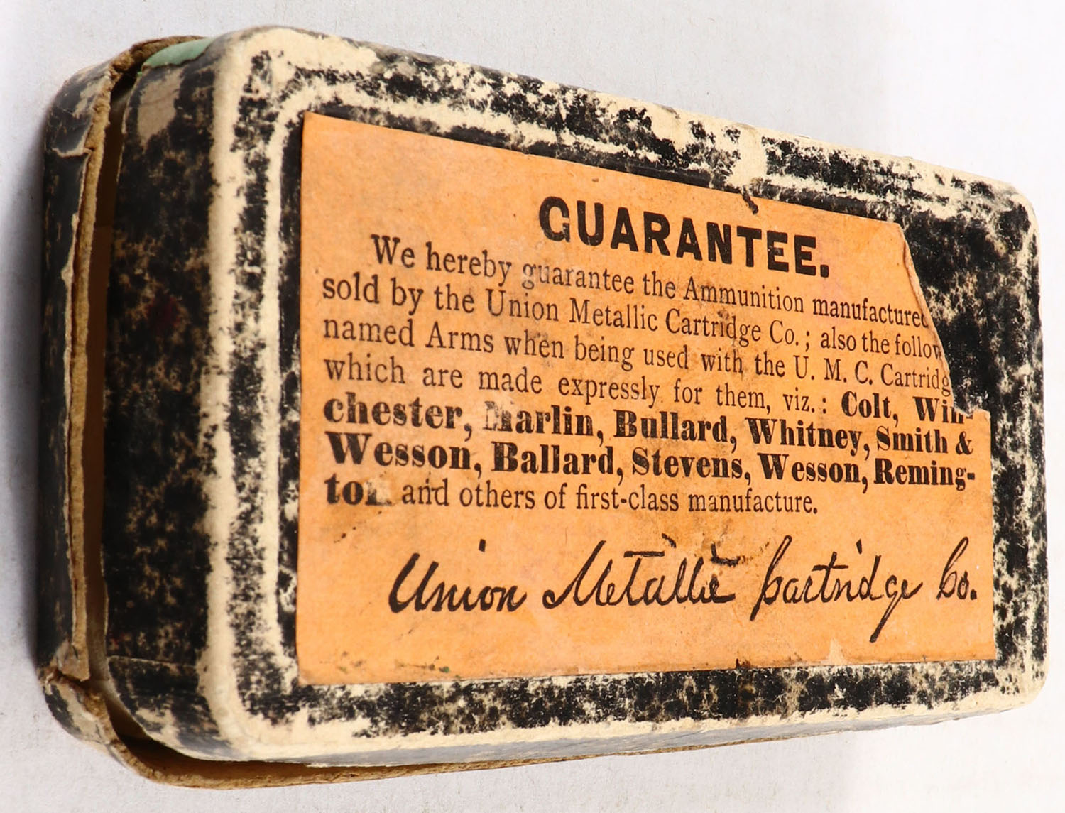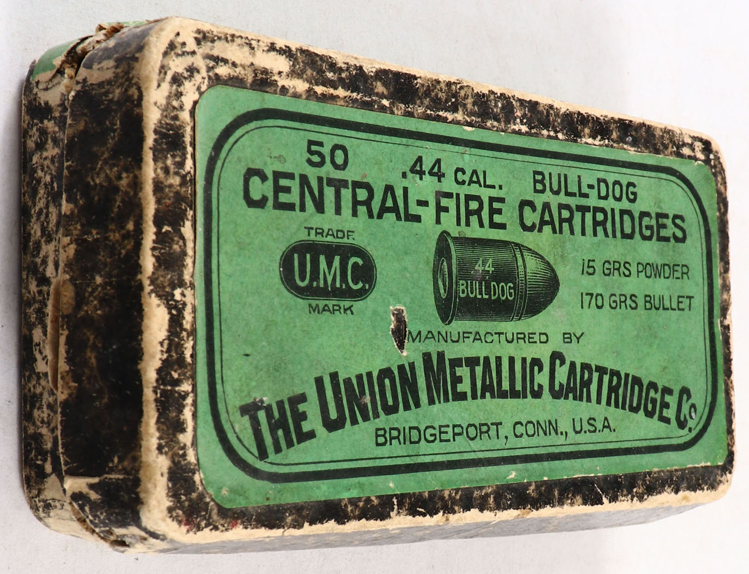 UMC, Central-Fire Cartridges, .44 Bull-Dog, 15 Grs. Powder, 170 Grs. Bullet, Partial 13rds., 2pc. Black mottled box with green top label, box is solid with excellent color, very minor age soiling, some edge & corner wear, label is intact, ammo is good. Grade: Very Good ++ - Value: 30 to 90
