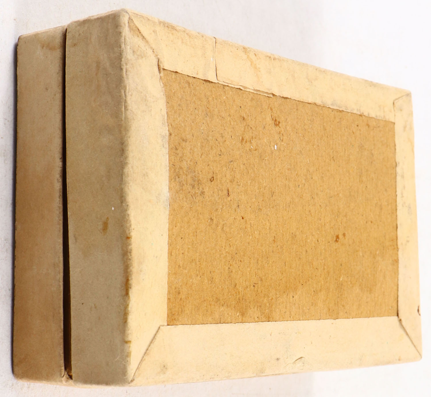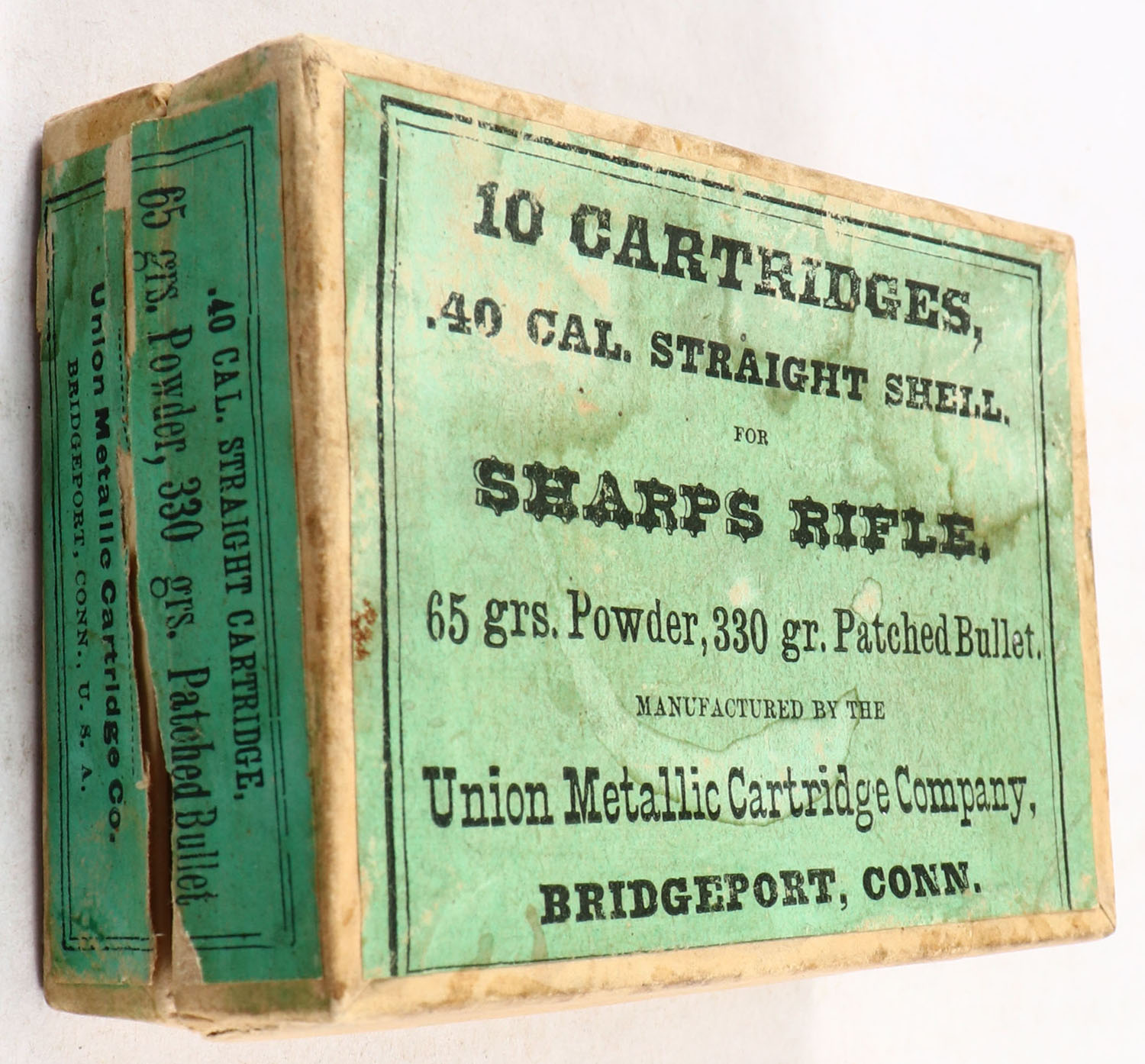 UMC, Sharps Rifle, .40 Cal. Straight Shell, 70 Grs. Powder, .330 Gr. Patched Bullet, Partial 5rds., 2pc. Buff box with green top label, box is solid with very good color, water stains on top, very minor corner wear, edges are crisp, labels are intact, ammo is excellent. Grade: Excellent - Value: 50 to 150