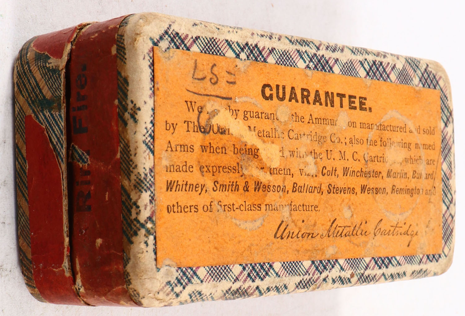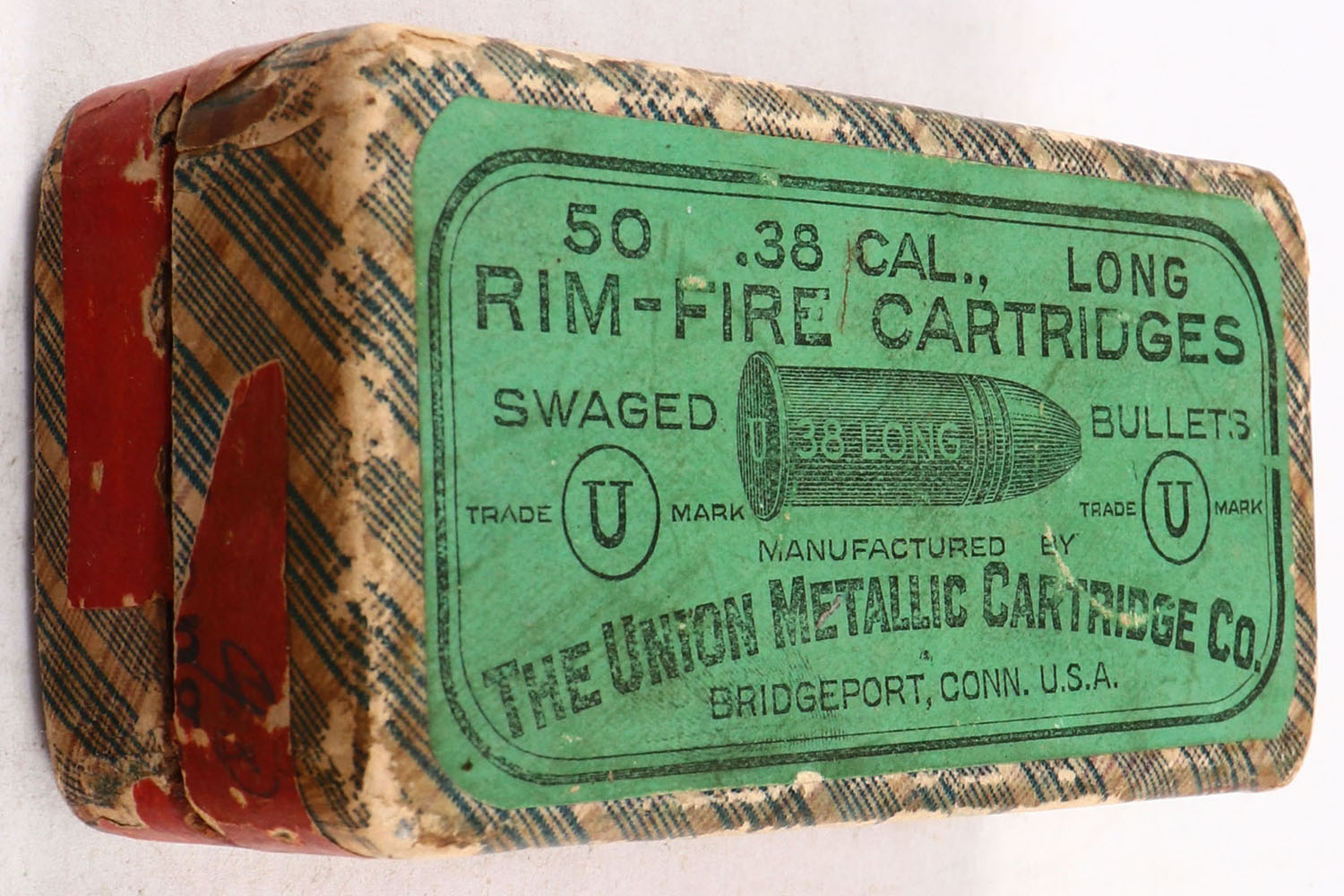 UMC, Rim Fire Cartridges, .38 Long Rim Fire, Full, 2pc. Purple fabric box with green top & red side sealing labels, box is solid with very good color, some color fading, very minor age soiling, some corner wear, minor edge wear, labels are intact, - Value: 50 to 200
