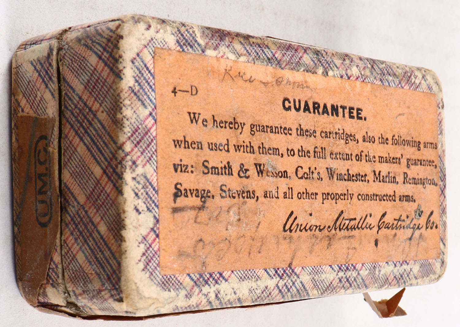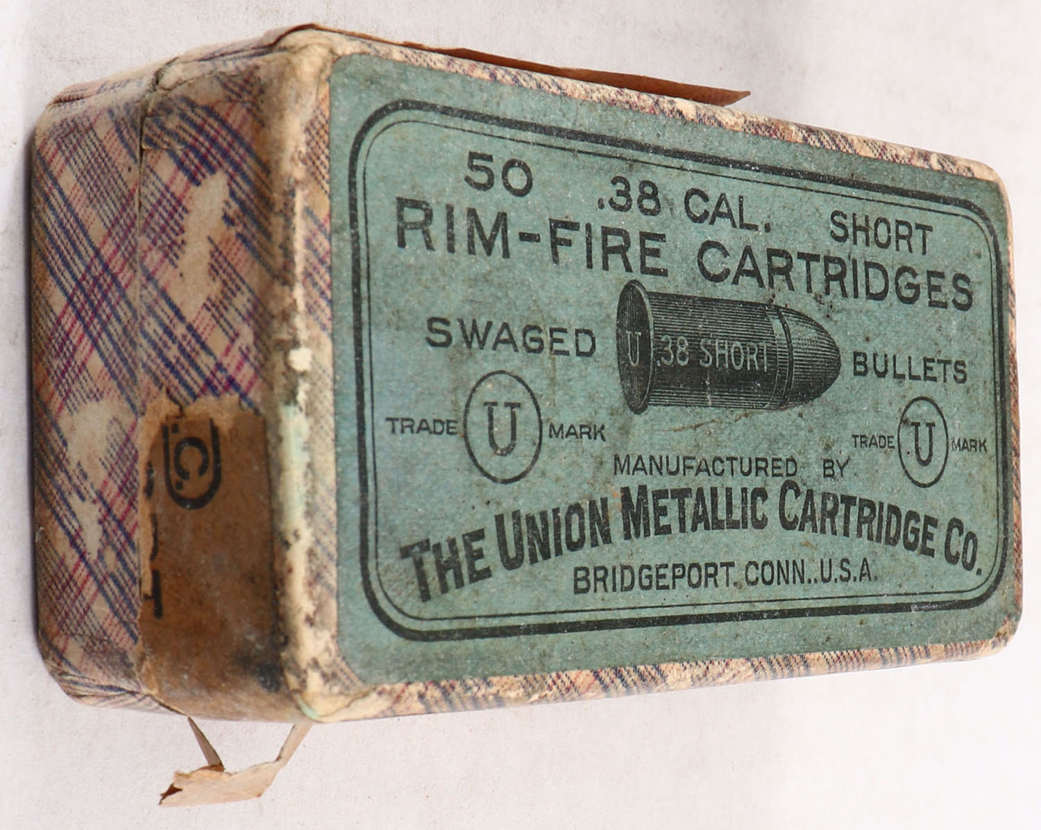 UMC, Rim-Fire Cartridges, .38 Short Rim Fire, Swaged Bullets, Full, 2pc. Purple fabric box with blue top & buff side sealing labels, box is solid with very good color, some age soiling & color fading, minor corner wear, front has been written on, edges are mostly crisp, side sealing label is 80% intact, ammo is good. Grade: Very Good - Value: 6 to 20