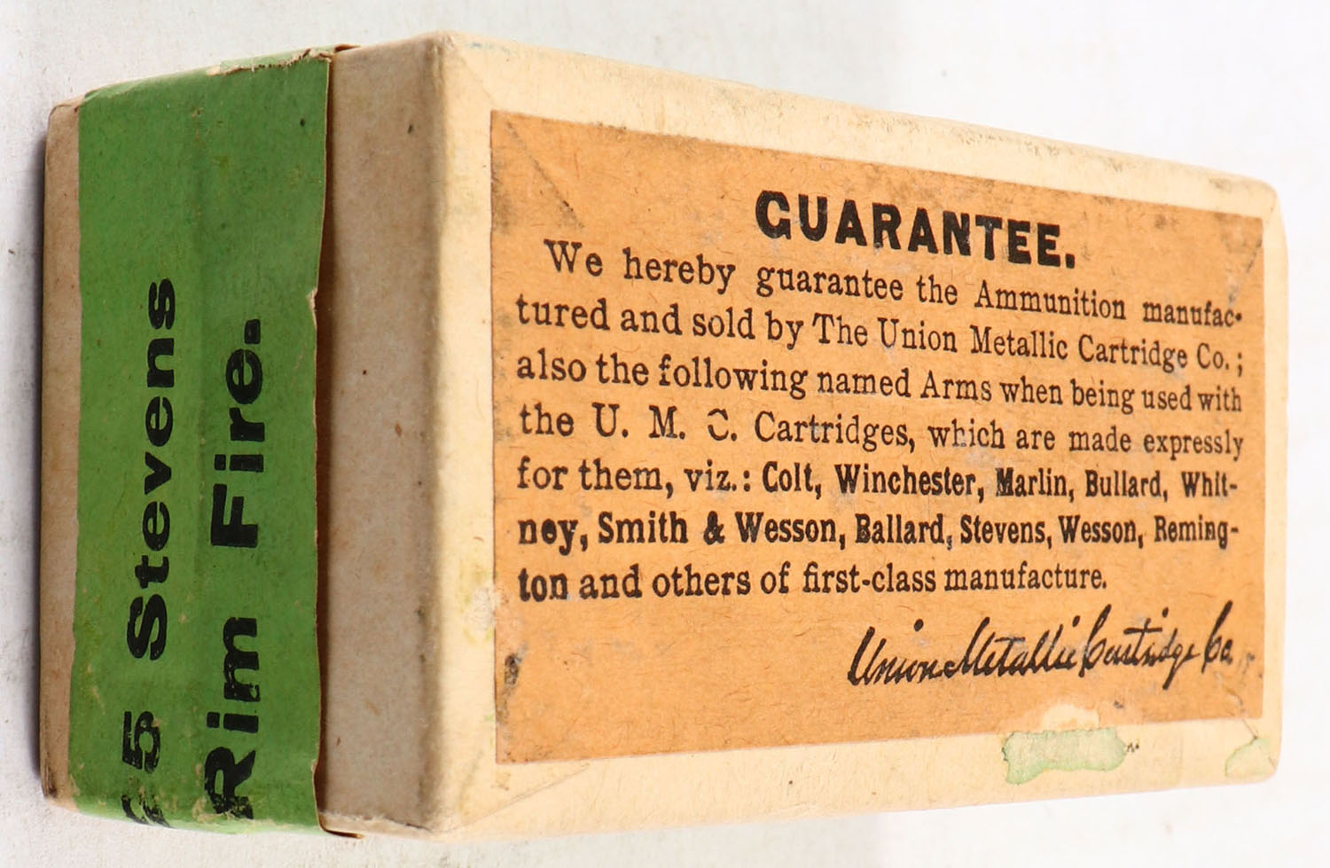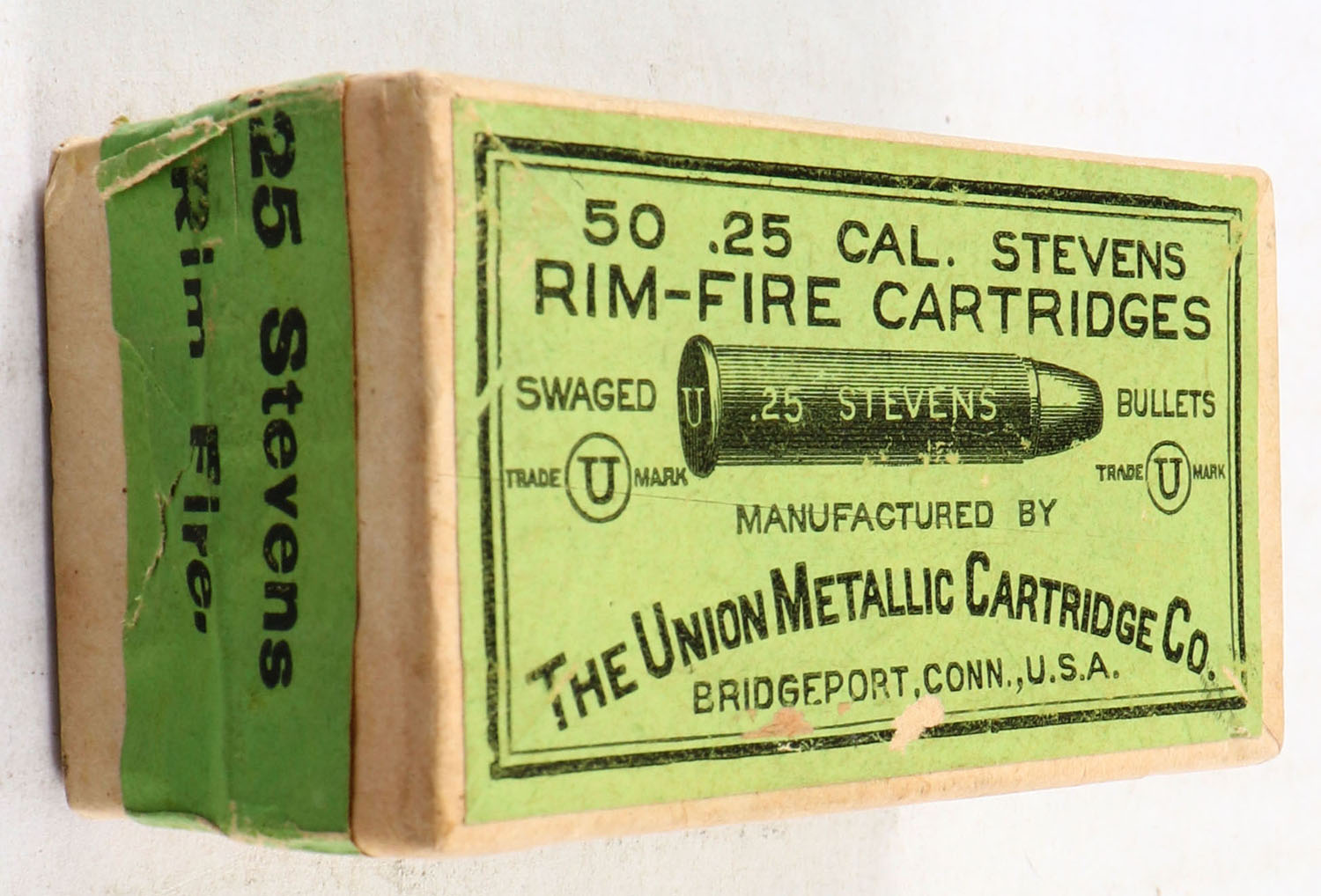 UMC, Rim-Fire Cartridges, .25 Stevens Rim Fire, Swaged Bullets, FULL & SEALED, 2pc. Buff box with green top & side sealing labels, box is near mint with minty color, only very minor corner wear & chipping to label, edges are crisp, labels are intact. Grade: Excellent ++ - Value: 80 to 240