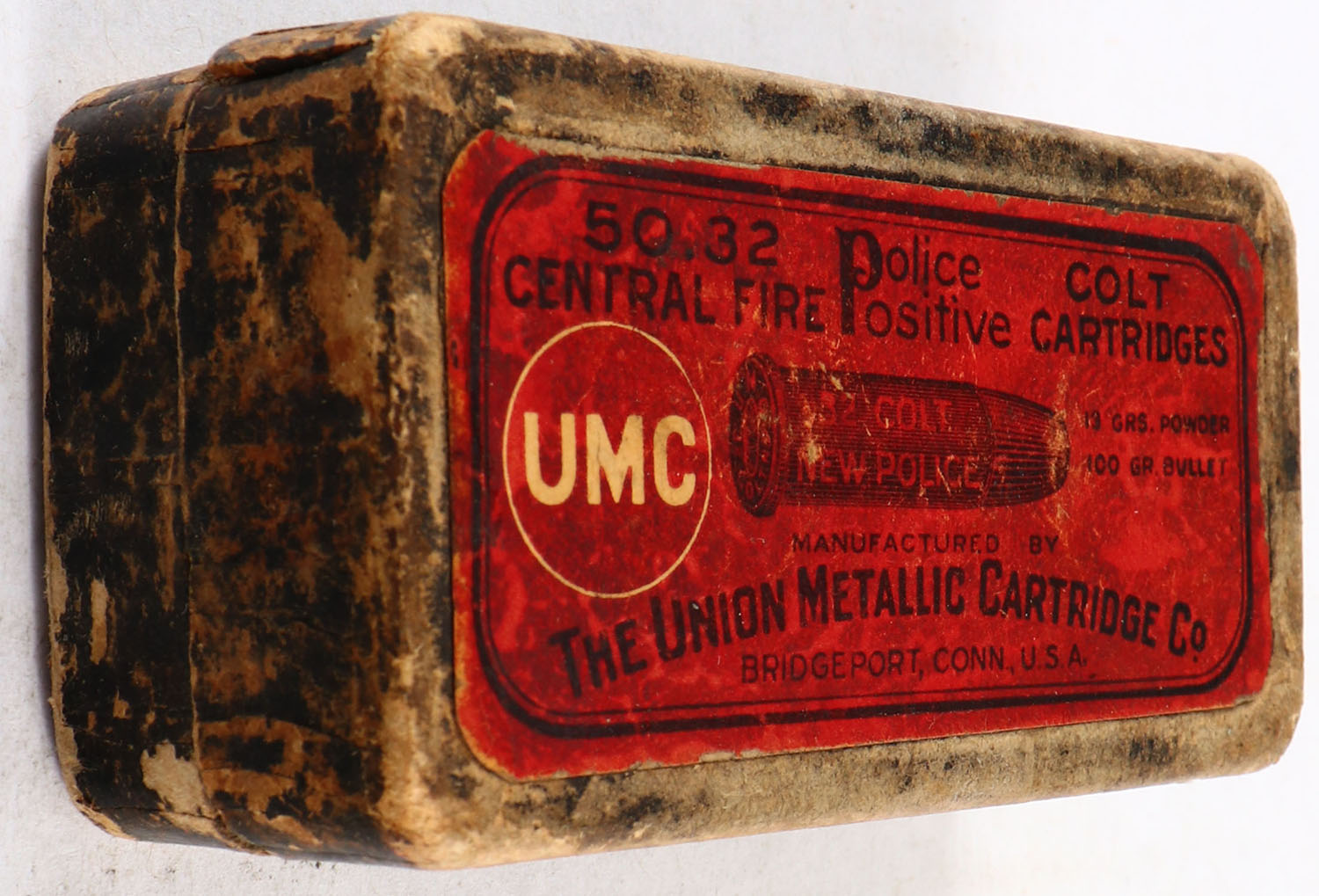 UMC, Central Fire Cartridges, .32 Colt Police Positive, 13 Grs. Powder, 100 Gr. Bullet, Full, 2pc. Black mottled box with red top label, side sealing label is gone, box is solid with very good color, some age soiling, minor shelf wear, some edge & corner wear, top label is intact, ammo is excellent. Grade: Very Good + - Value: 16 to 60