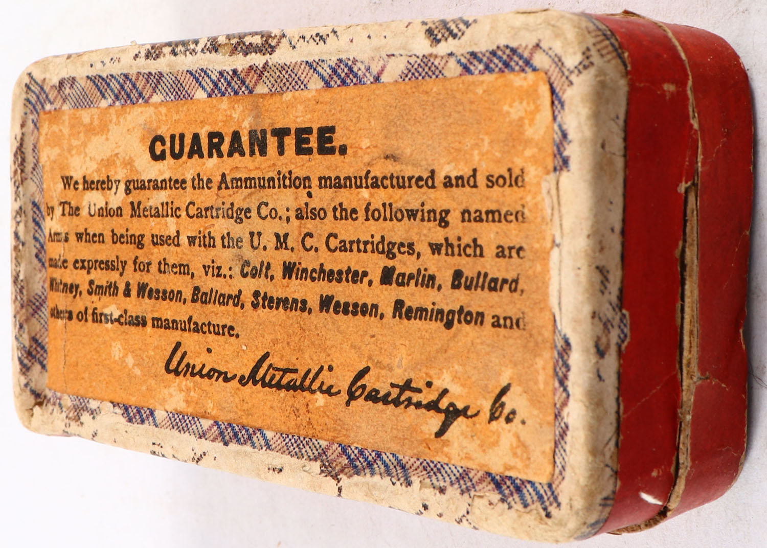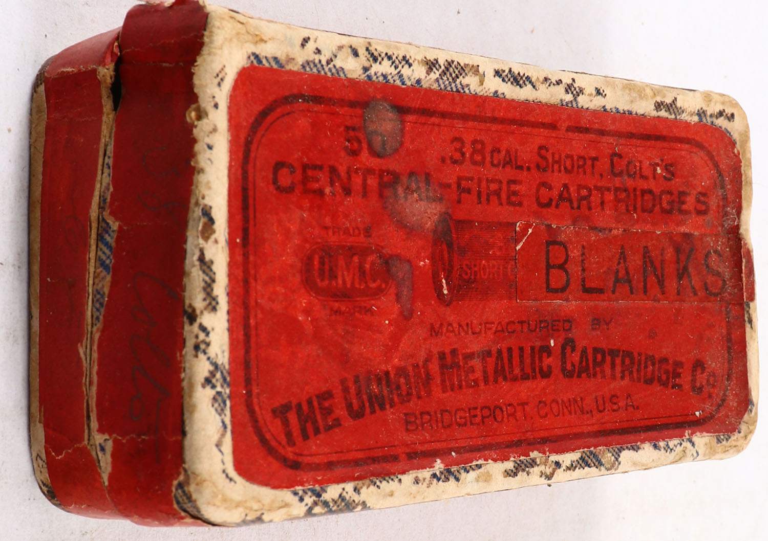 UMC, Central-Fire Cartridges, .38 Short Colt Blanks, Partial 43rds., 2pc. Purple fabric box with red top & side sealing labels, red ''Blanks'' over-label box is solid with good color, minor age soiling, some color fading & staining, some edge & corner wear, labels are intact. Grade: Very Good - Value: 8 to 40