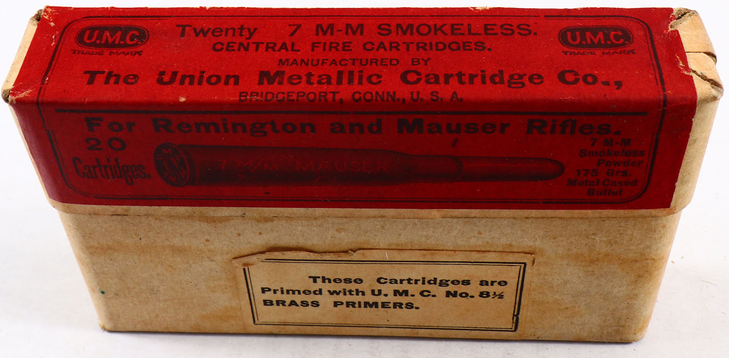 UMC, Central Fire Cartridges, 7mm Mauser, 175 Grs. Metal Cased Bullet, Smokeless Powder, Full, 2pc buff box with red label, box is solid with excellent color, minor age soiling & corner wear, edges are crisp, label is intact, ammo is excellent to minty. Grade: Excellent - Value: 20 to 60