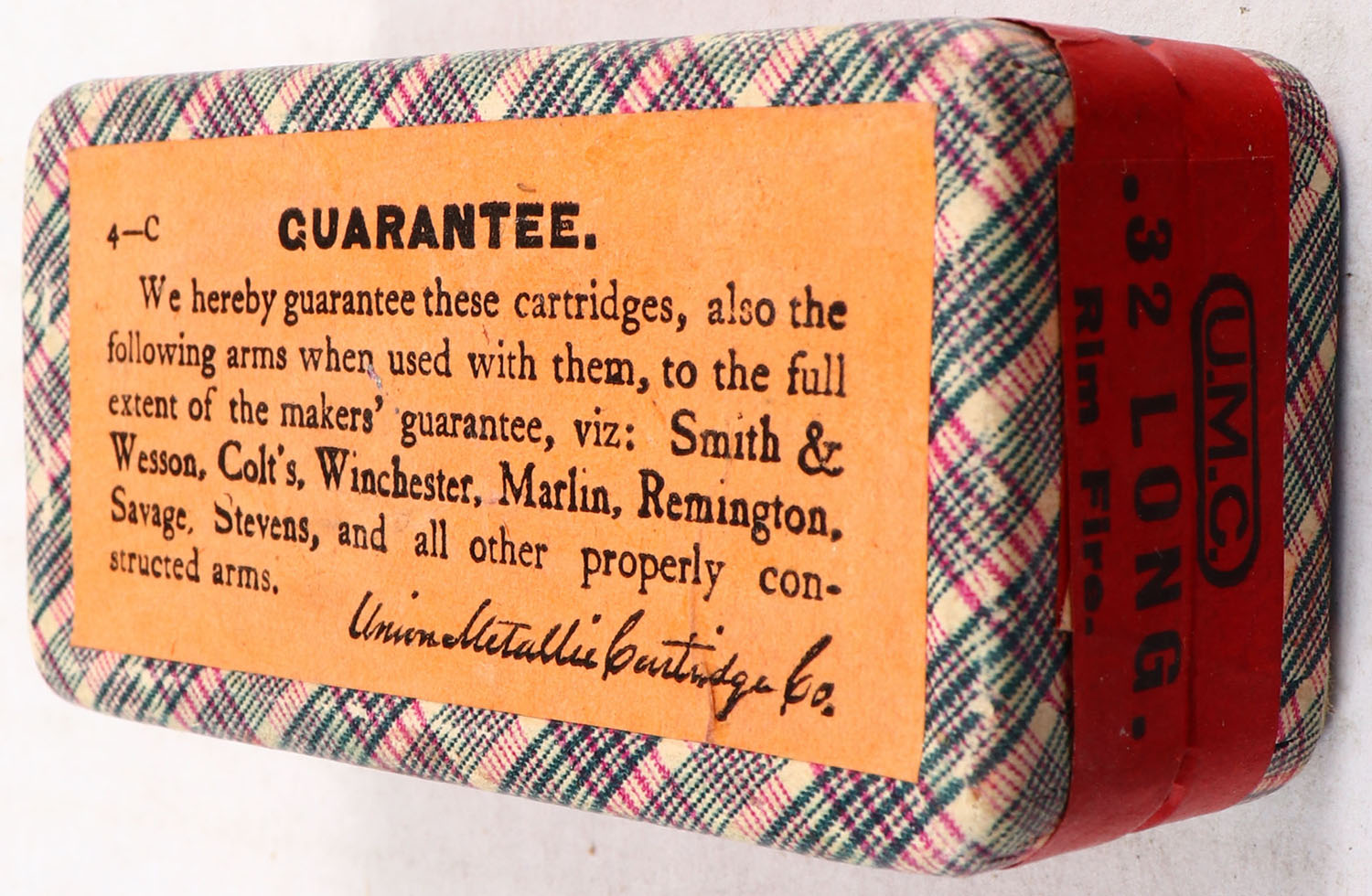 UMC, Rim-Fire Cartridges, .32 Long Rim Fire, Swaged Bullets, FULL & SEALED, 2pc. Purple fabric box with pink top & red side sealing labels, box is near mint with excellent to minty color, very minor age soiling & corner wear, edges are crisp, labels are intact. Grade: Excellent ++ - Value: 40 to 120