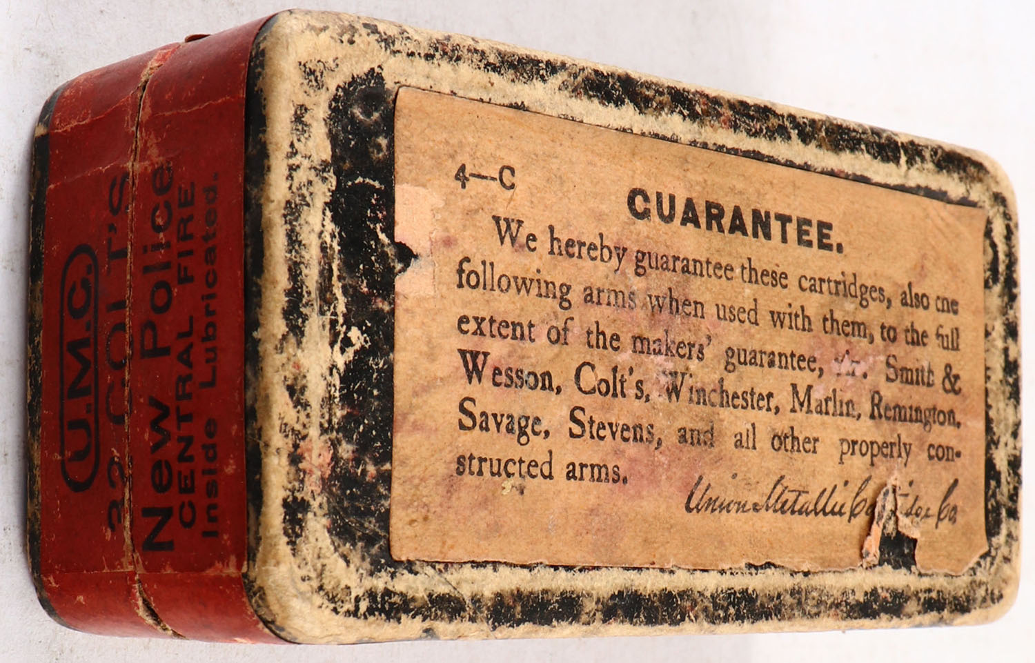 UMC, Central-Fire Cartridges, .32 Colt's New Police, 13 Gr's Powder, 100 Gr's Bullet, Full, 2pc. Black mottled box with red top & side sealing labels, box is solid with very good color, minor age soiling, some shelf wear, some edge & corner wear, labels are intact, ammo is excellent. Grade: Very Good + - Value: 20 to 60