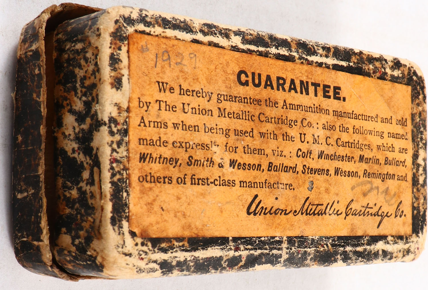 UMC, Central-Fire Cartridges, .38 Smith & Wesson, 15 Grs Powder, 146 Grs Bullet, Partial 30rds., 2pc. Black mottled box, box is solid with good color, some age soiling & shelf wear, staining to top, some edge & corner wear, top label is intact, side sealing label is gone, ammo is very good. Grade: Good ++ - Value: 8 to 40