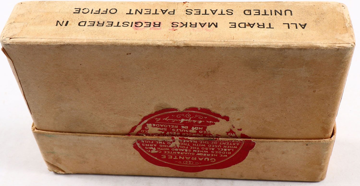 UMC, Central Fire Cartridges, .30 Springfield 1906 (.30-06), 172 Grain Thomas Pointed Bullet, Full, 2pc. Buff box with buff label, box is solid with very good to excellent color, very minor age soiling, scuff on front, minor corner wear, edges are mostly crisp, label is intact, ammo is good. Grade: Very Good ++ - Value: 20 to 60