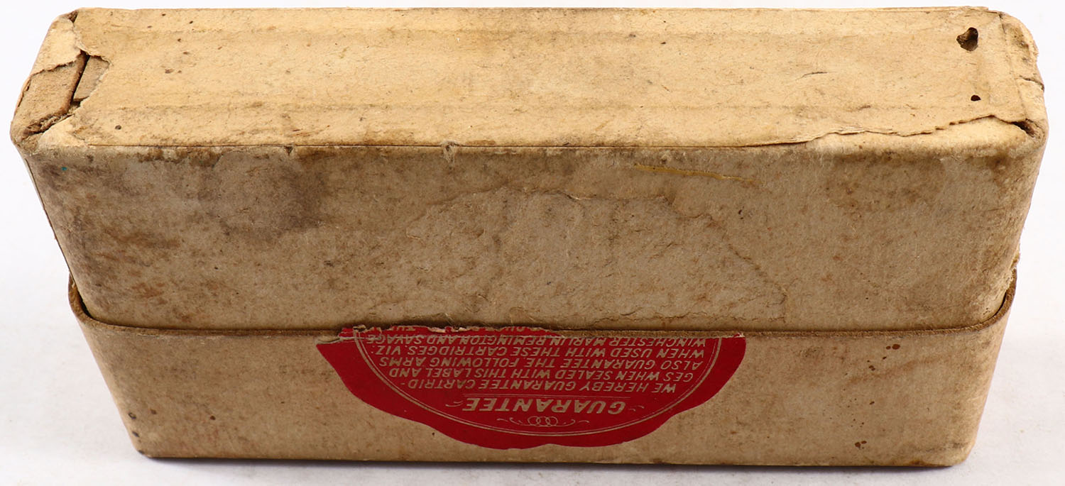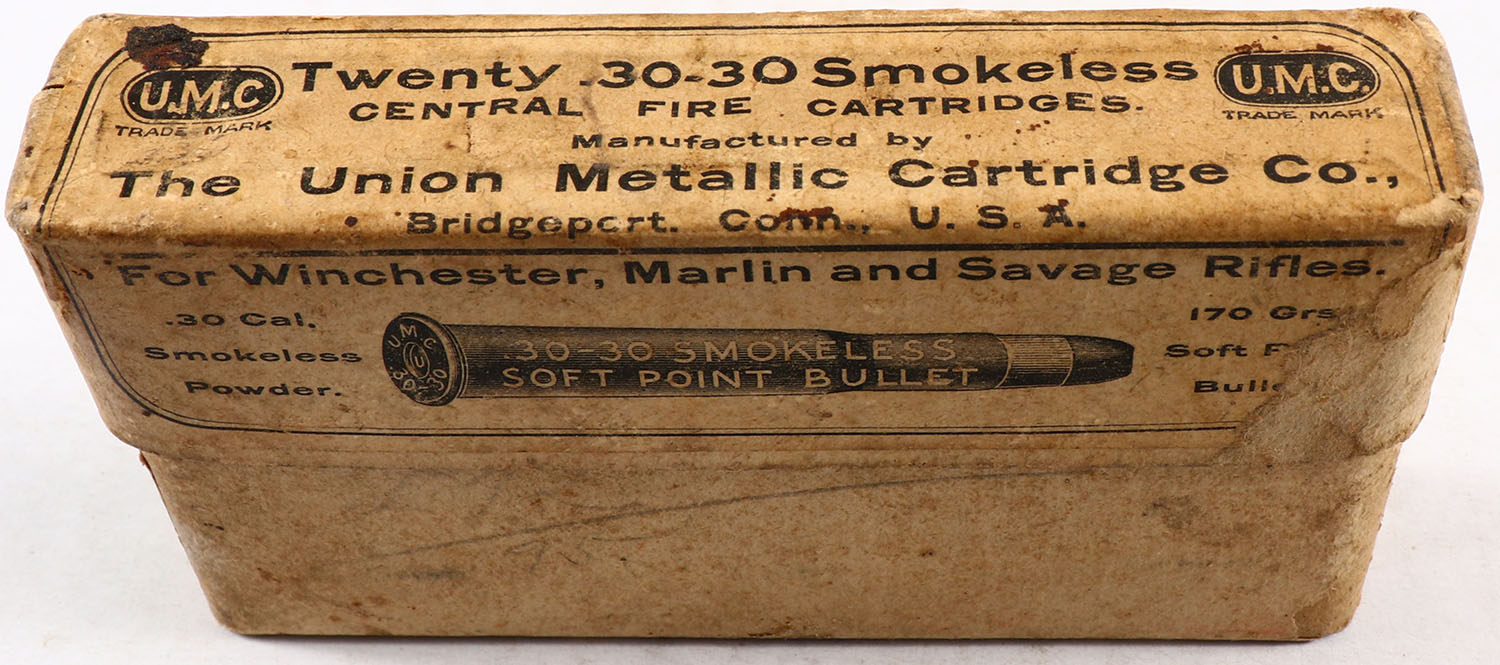 UMC, Central Fire Cartridges, .30-30 Smokeless, Empty, 2pc. Buff box with buff label, incorrect box bottom, box is solid with very good color, some age soiling & corner wear, front has been written on, label is 95% intact. Grade: Very Good - Value: 2 to 10