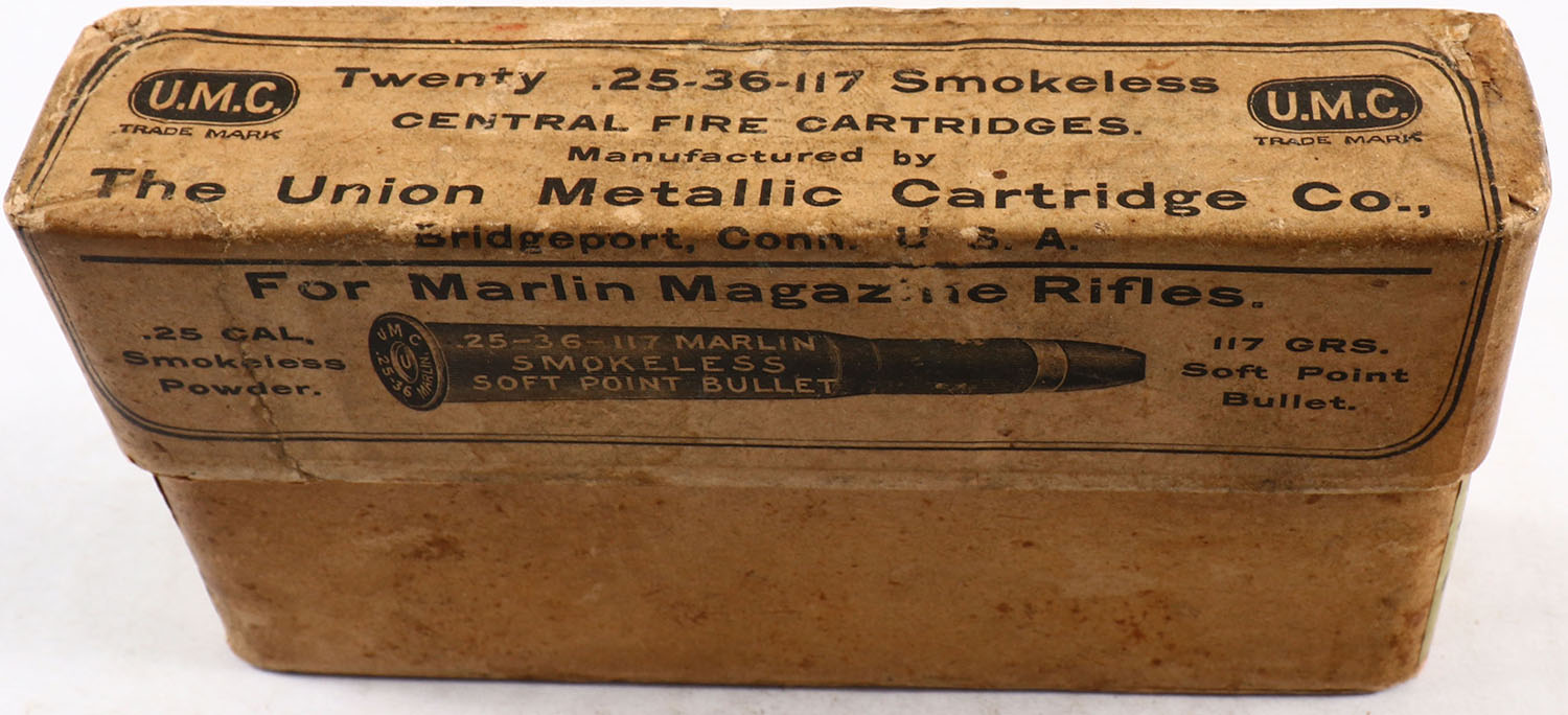 UMC, Central Fire Cartridges, .25-36 Marlin, 117 Soft Point Bullet, Partial 4rds., 2pc. Buff box with buff label, box is solid with excellent color, minor age soiling & corner wear, edges are mostly crisp, label is intact, ammo is excellent. Grade: Very Good + - Value: 8 to 40