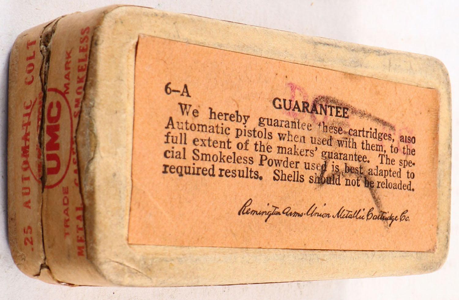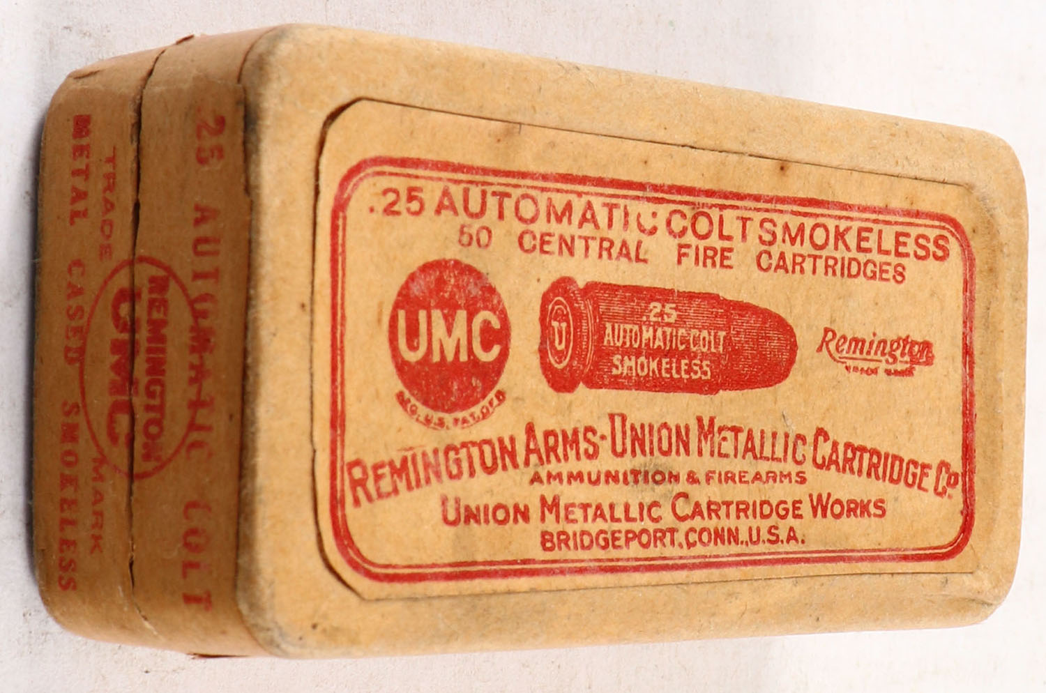 REM-UMC, Central Fire Cartridges, .25 Automatic Colt, Metal Cased, Smokeless, Partial 22rds., 2pc. Buff box with buff top & side sealing labels, box is solid with excellent color, minor age soiling corners are mostly sharp, edges are crisp, labels are intact, ammo is excellent. Grade: Excellent - Value: 10 to 50