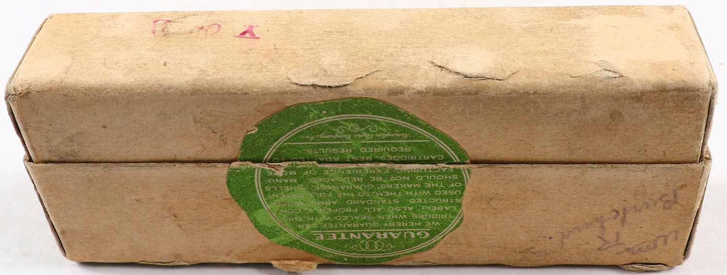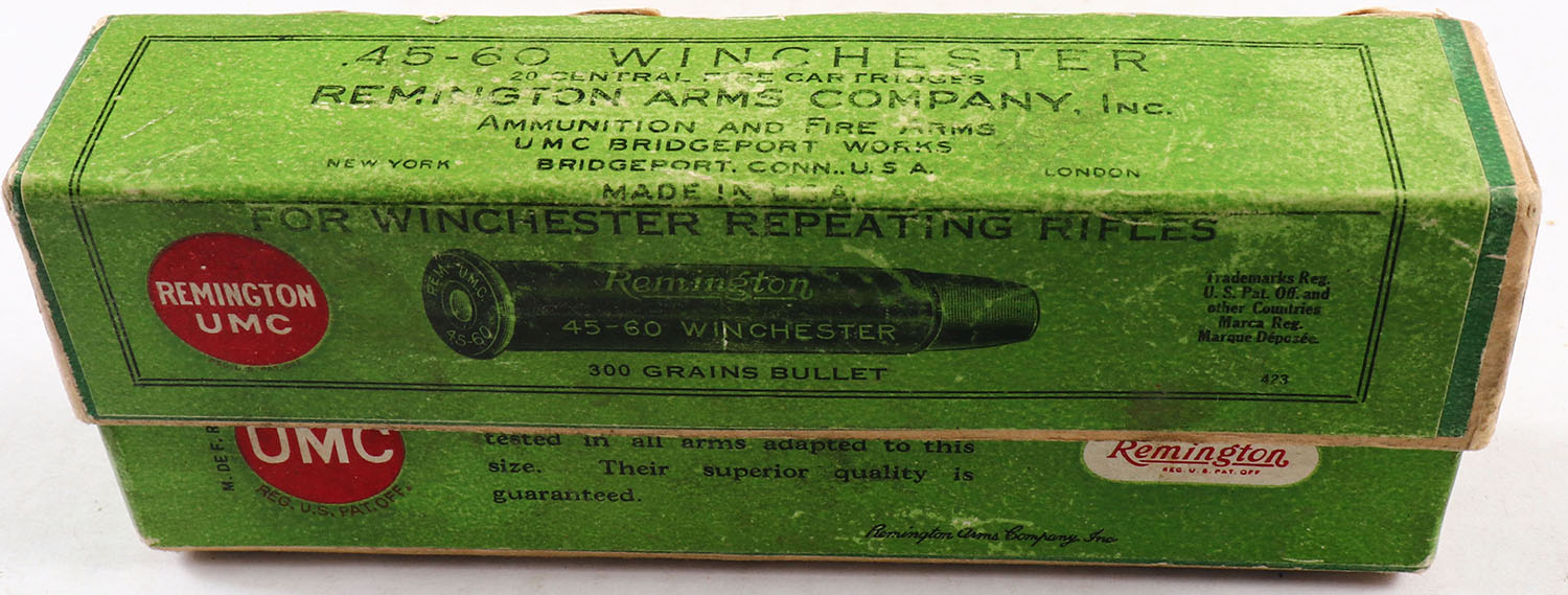 REM-UMC, Central Fire Cartridges, .45-60 Winchester, 300 Grains Bullet, Partial 19rds., 2pc. Buff box with green labels, box is solid with excellent color, minor shelf wear, very minor corner wear, edges are crisp, labels are intact, ammo is very good. Grade: Excellent - Value: 40 to 120