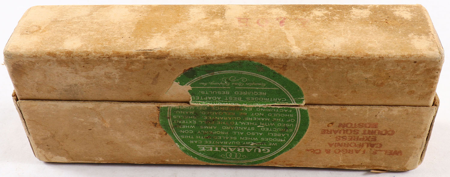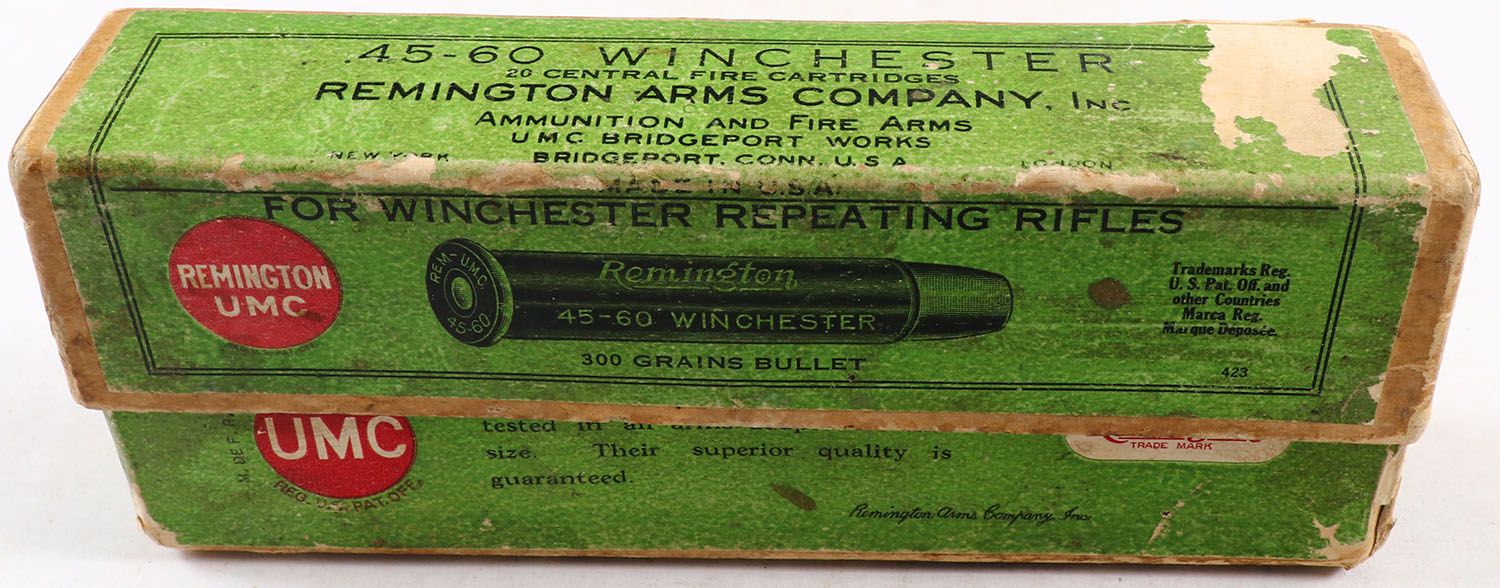 REM-UMC, Central Fire Cartridges, .45-60 Winchester, 300 Grains Bullet, Full of incorrect ammo, 2pc. Buff box with green labels, box is solid with very good to excellent color, minor age soiling scuffing on top, minor edge & corner wear, labels are intact, ammo is very good. Grade: Very Good + - Value: 40 to 120