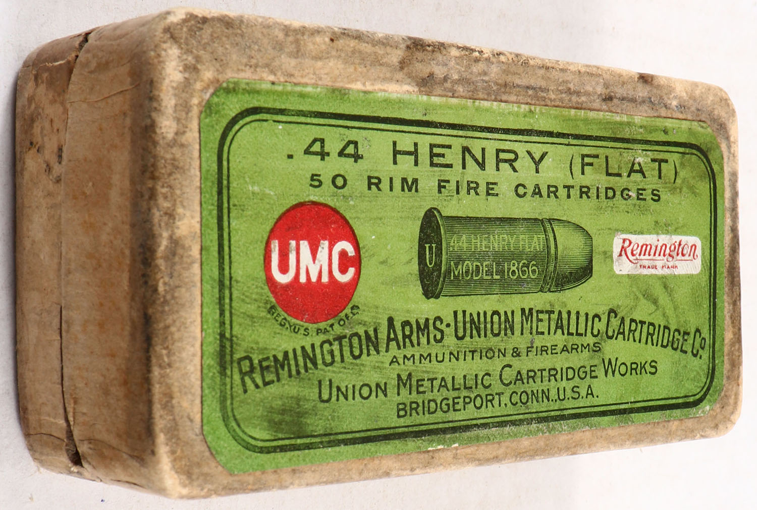 REM-UMC, Rim Fire Cartridges, .44 Henry Flat, Full, 2pc. Buff box with green top label, side sealing label is gone, very good color, some age soiling, very minor corner wear, edges are mostly crisp, top label is intact, ammo is very good. Grade: Very Good + - Value: 800 to 2400
