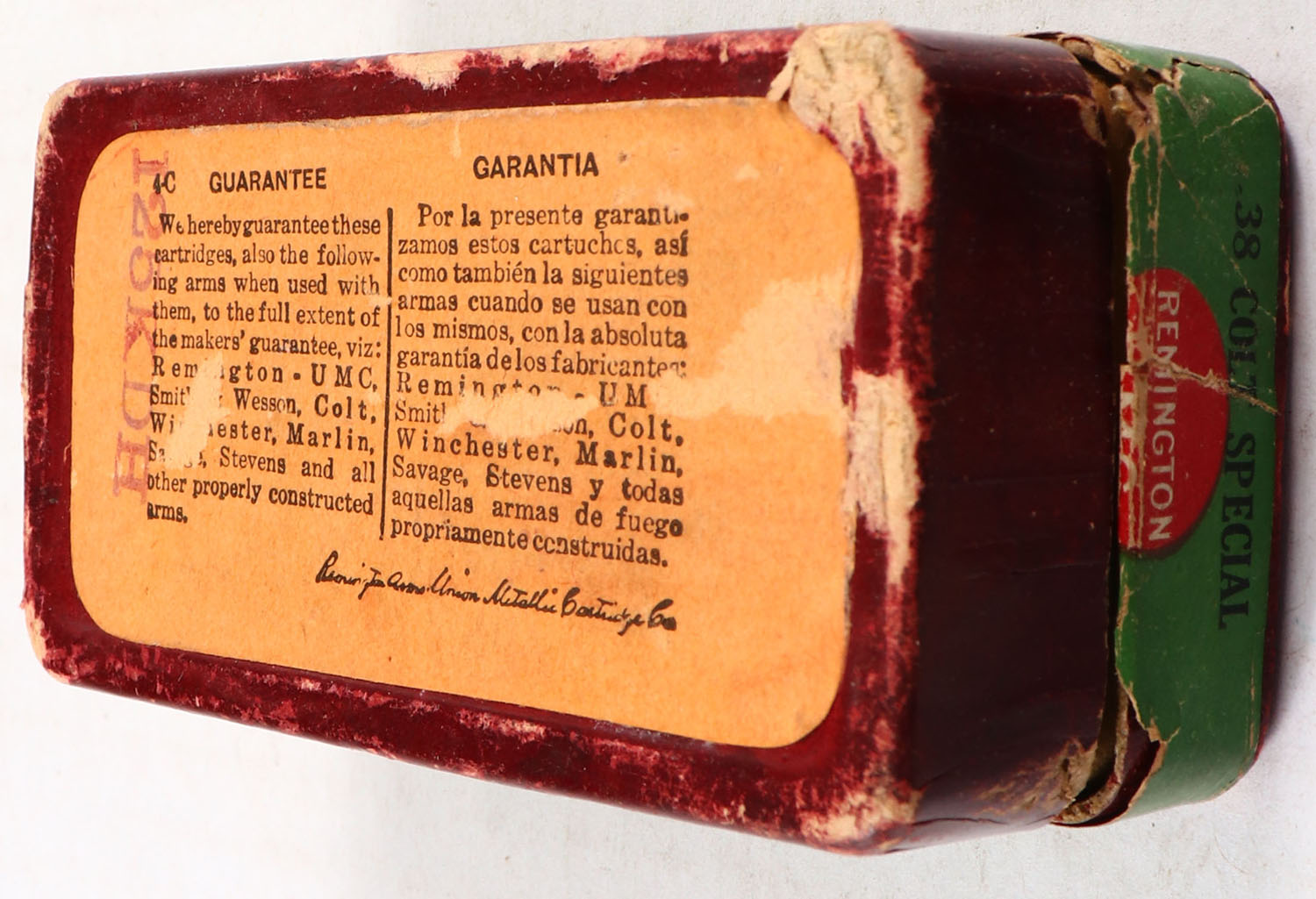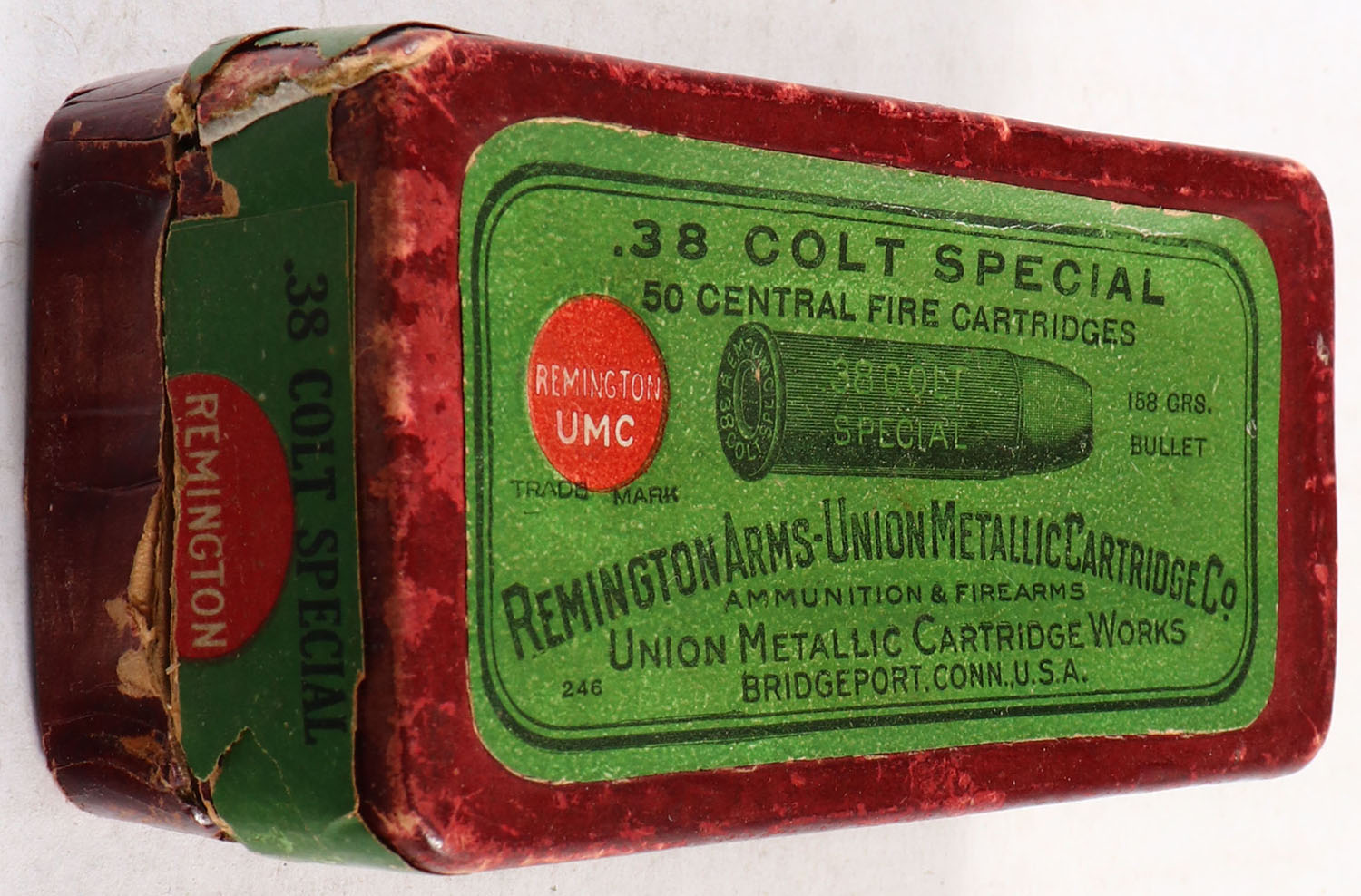 REM-UMC, Central Fire Cartridges, .38 Colt Special, 158 Grs. Bullet, Full of mixed ammo, 2pc. Red box with green top & side sealing labels, box is solid with excellent color, very minor age soiling & shelf wear, very minor corner wear, edges are mostly crisp, side sealing label is 50% intact, ammo is very good to excellent. Grade: Very Good - Value: 10 to 50