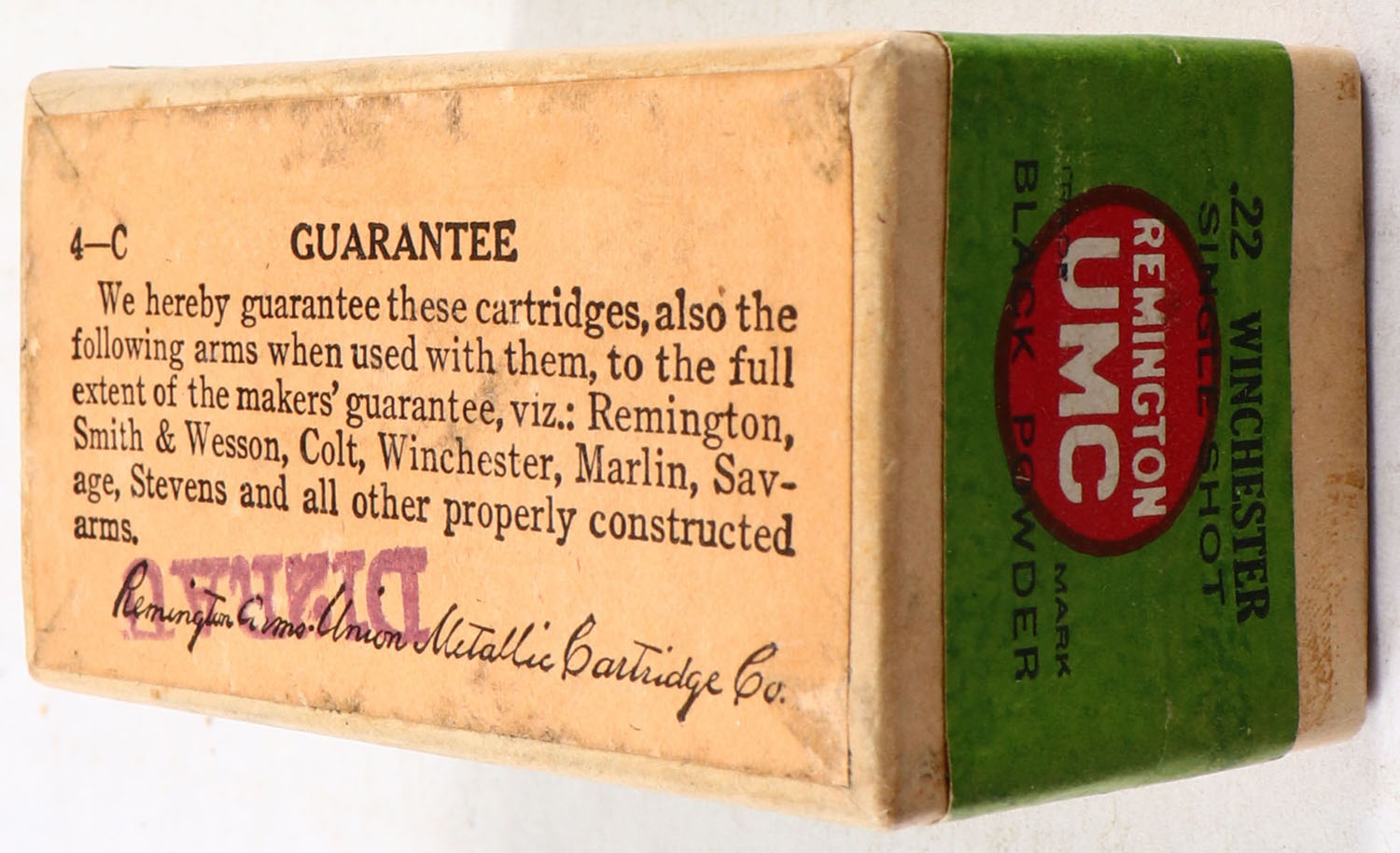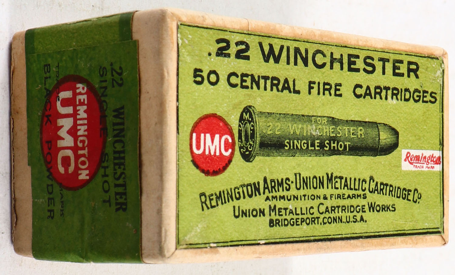 REM-UMC, Central Fire Cartridges, .22 Winchester Single Shot, FULL & SEALED, 2pc. Buff box with green top & side sealing labels, box is solid with excellent to minty color, very minor edge & corner wear, labels are intact. Grade: Excellent ++ - Value: 100 to 300