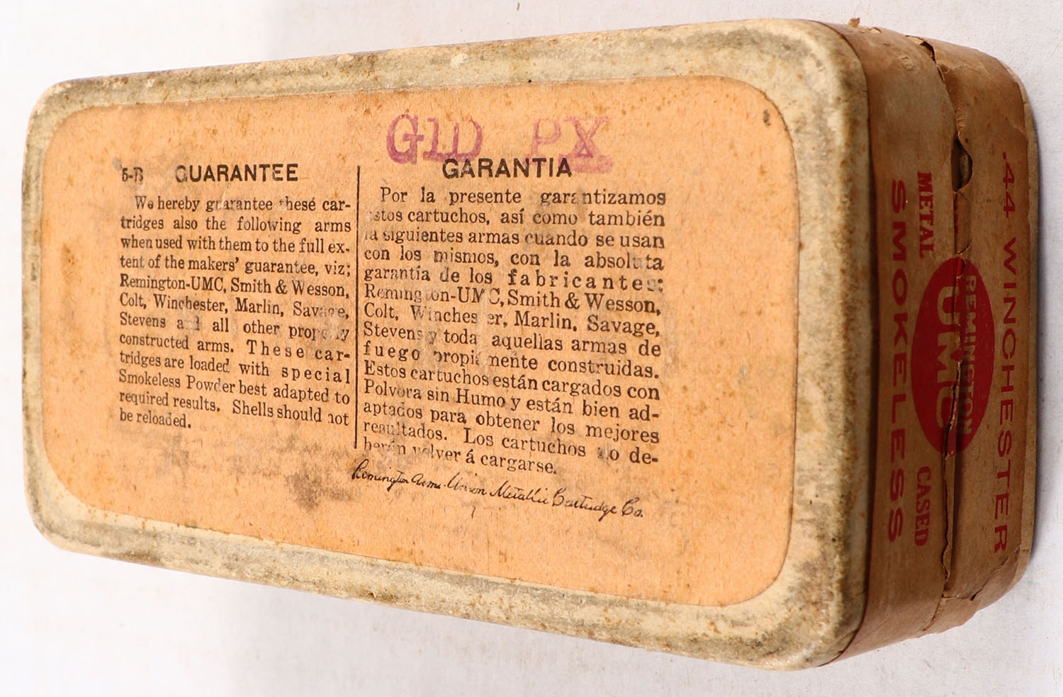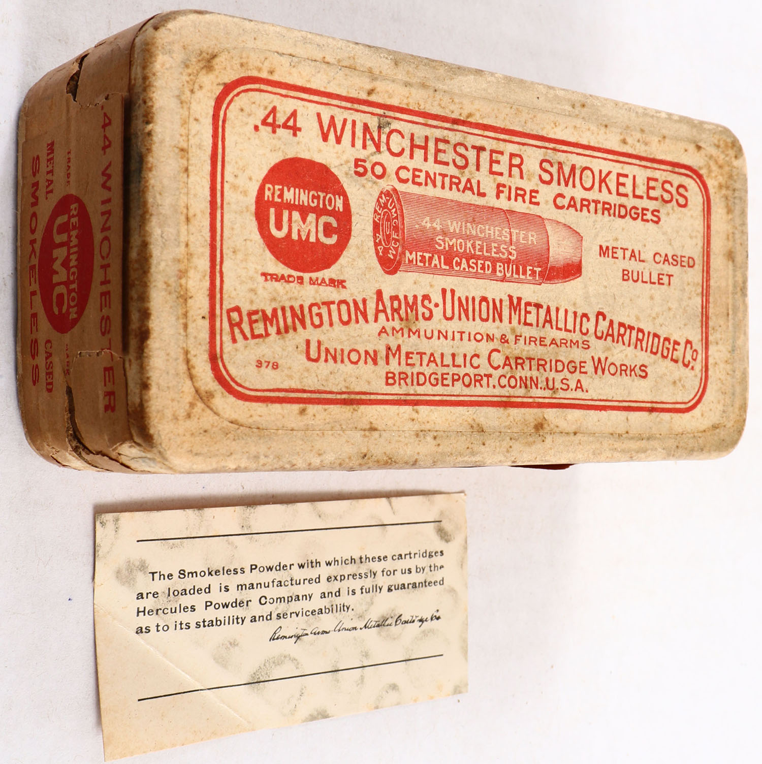 REM-UMC, Central Fire Cartridges, .44 Winchester, Metal Cased Bullet, Full with insert, 2pc. Buff box with buff top & side sealing labels, box is solid with very good color, some age soiling & staining, very minor corner wear, edges are mostly crisp, side sealing label is 95% intact, insert is very good, ammo is excellent. Grade: Very Good + - Value: 50 to 200