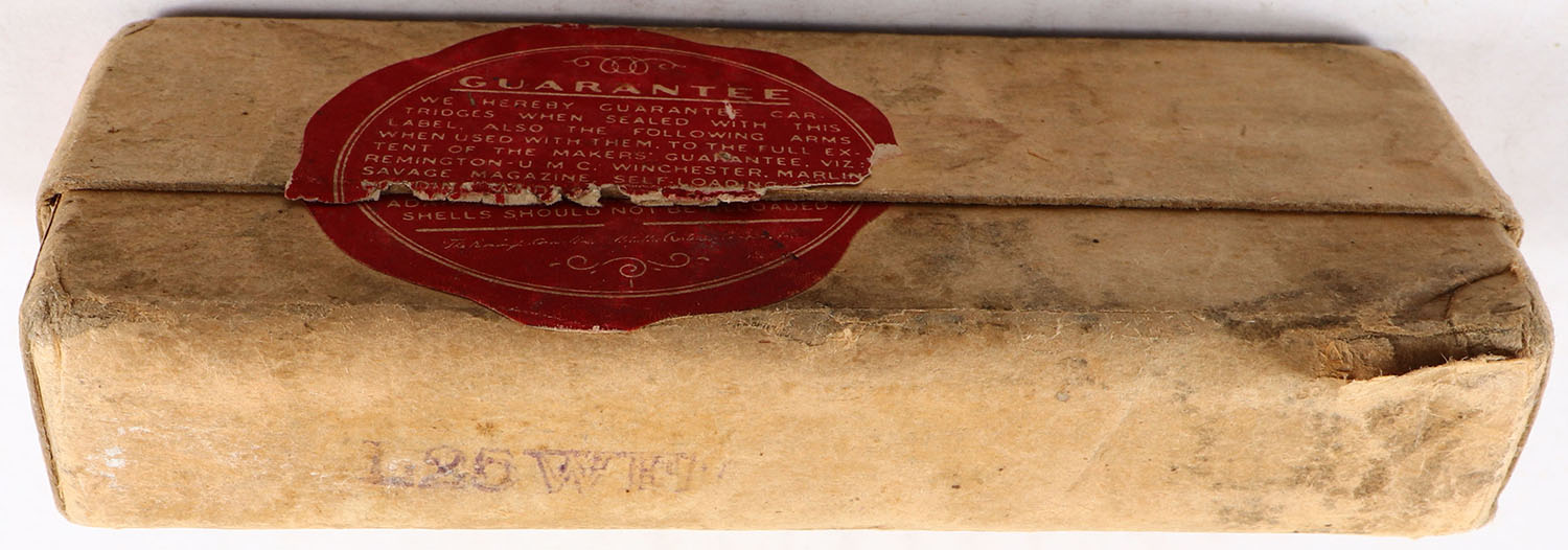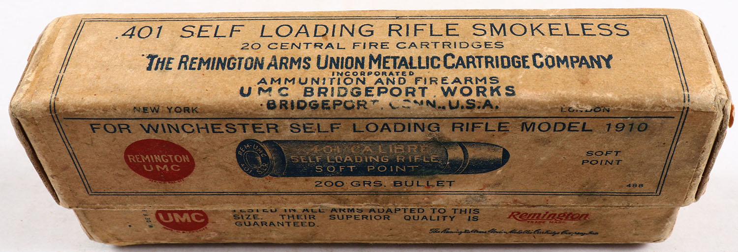 REM-UMC, Central Fire Cartridges, .401 Self Loading Rifle, 200 Grs. Soft Point Bullet, Full, 2pc. Buff box with buff labels, box is solid with excellent color, very minor age soiling, some corner wear, edges are mostly crisp, labels are intact, ammo is excellent. Grade: Excellent - Value: 50 to 150