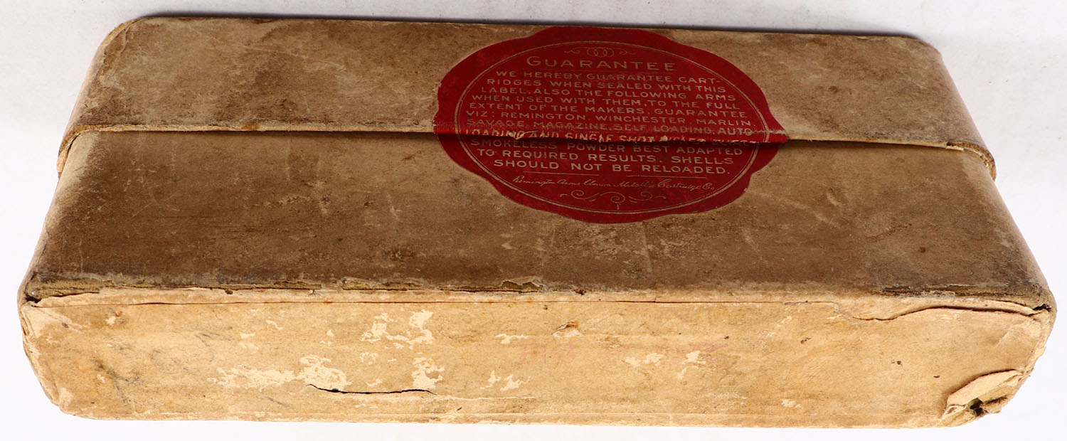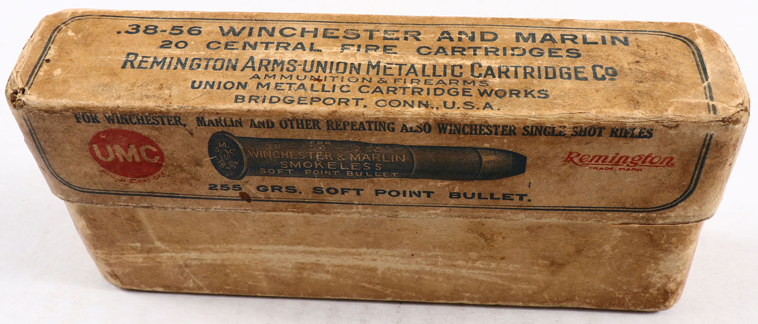 REM-UMC, Central Fire Cartridges, .38-56 Winchester, 255 Grs. Soft Point Bullet, Full, 2pc. Buff box with buff label, box is solid with very good color, some age soiling & shelf wear, corner wear, minor edge wear, label is intact, ammo is very good. Grade: Very Good + - Value: 60 to 180