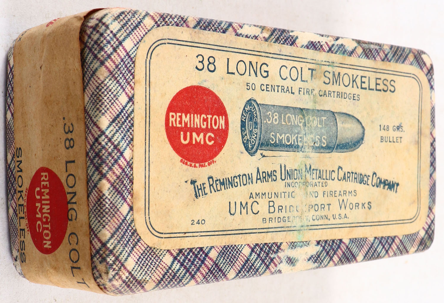 REM-UMC, Central Fire Cartridges, .38 Long Colt, 148 Grs. Bullet, FULL & SEALED, 2pc. Purple fabric box with buff top & side sealing labels, box is solid with very good to excellent color, very minor age soiling, some shelf wear, very minor corner wear, edges are mostly crisp, labels are intact. Grade: Very Good ++ - Value: 40 to 120