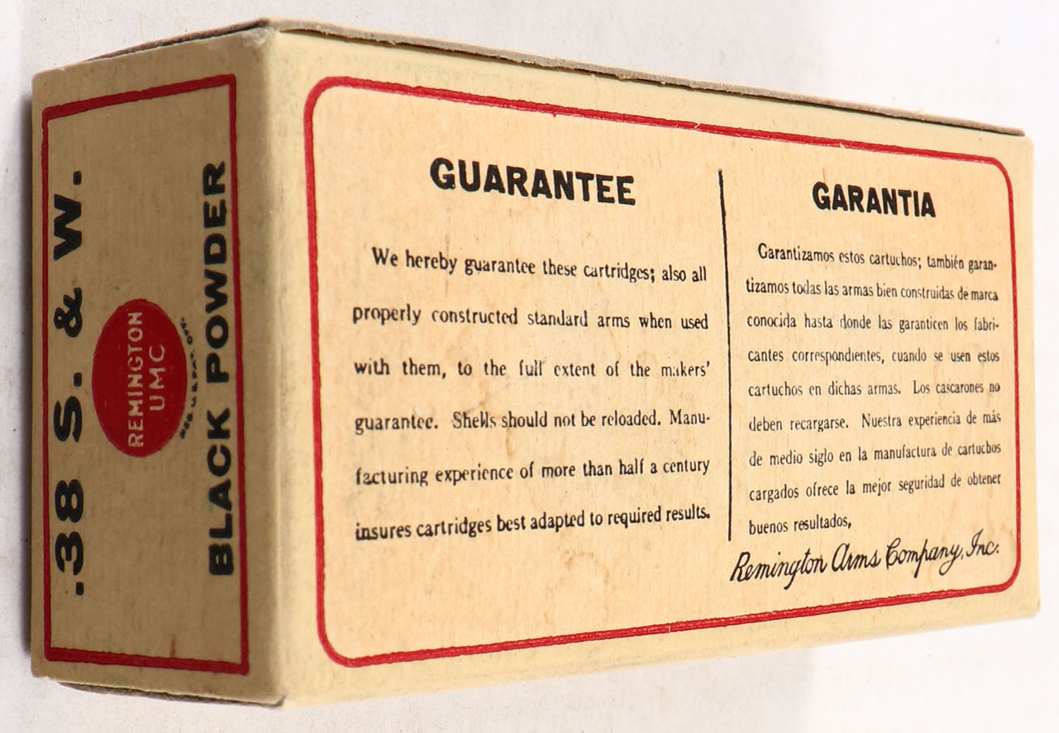 REM-UMC, Central Fire Cartridges, .38 Smith & Wesson, 146 Grs. Bullet, Partial 49rds., 1pc. Buff black & red box, box is MINT with minty color, corners are sharp, edges are crisp, end flaps are solid, ammo is excellent. Grade: MINT - Value: 40 to 120