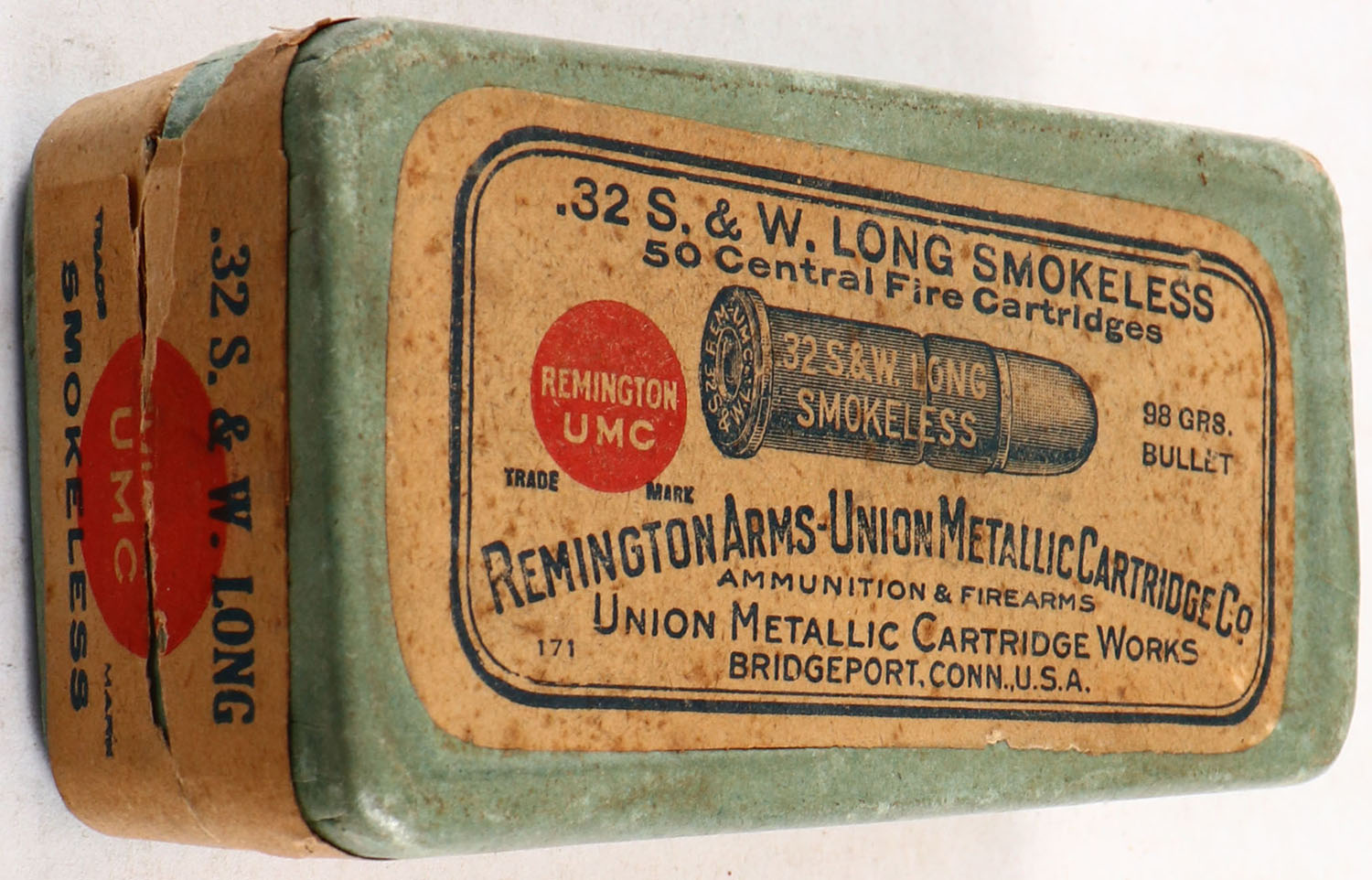 REM-UMC, Central Fire Cartridges, .32 Smith & Wesson Long, 98 Grs. Bullet, Full, 2pc. Blue box with buff top & side sealing labels box is solid with very good to excellent color, minor age soiling, very minor staining on top, very minor corner wear, edges are crisp, side sealing label is 80% intact, ammo is very good. Grade: Very Good ++ - Value: 30 to 90
