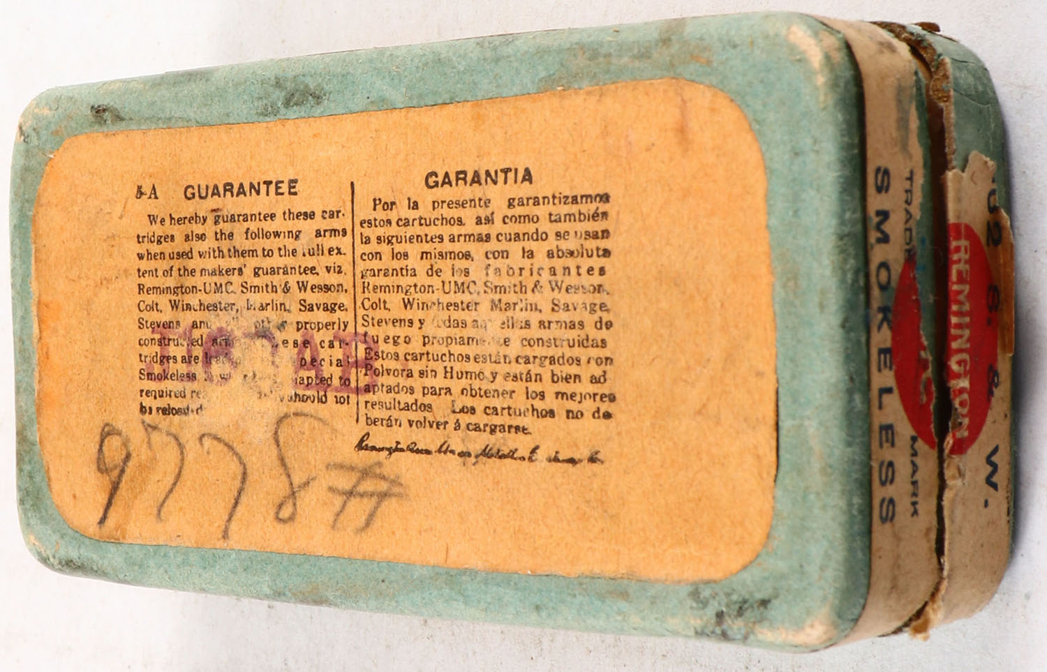 REM-UMC, Central Fire Cartridges, .32 Smith & Wesson, 88 Grs. Bullet, Partial 36rds, 1pc. Blue box with buff top & side sealing labels, box is solid with excellent color, very minor age soiling & shelf wear, minor edge & corner wear, side sealing label is 70% intact, ammo is excellent. Grade: Very Good + - Value: 10 to 50