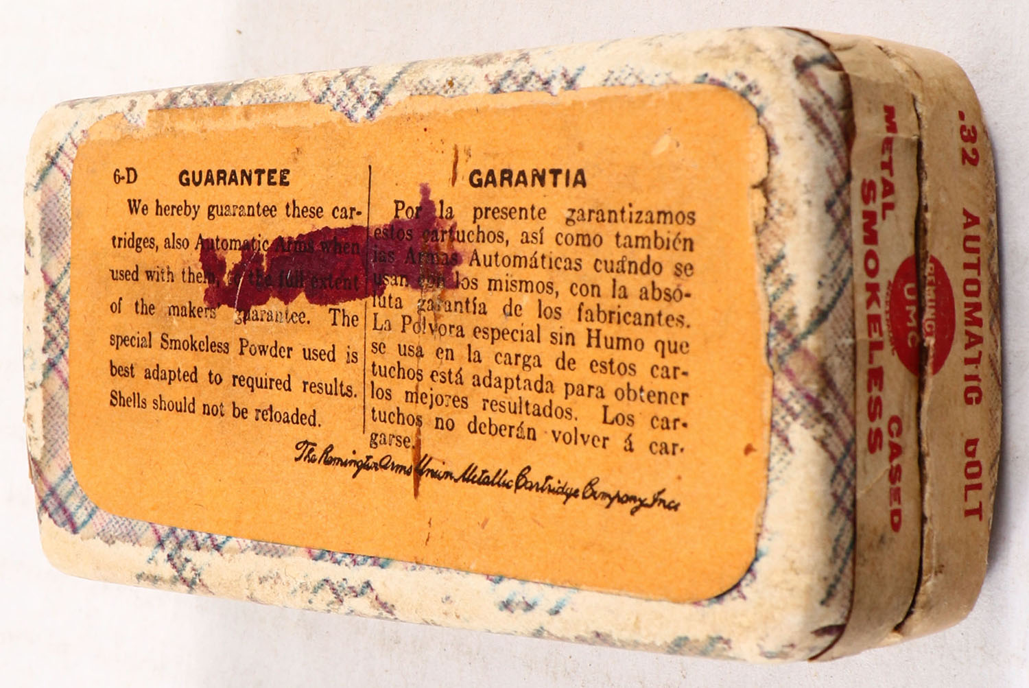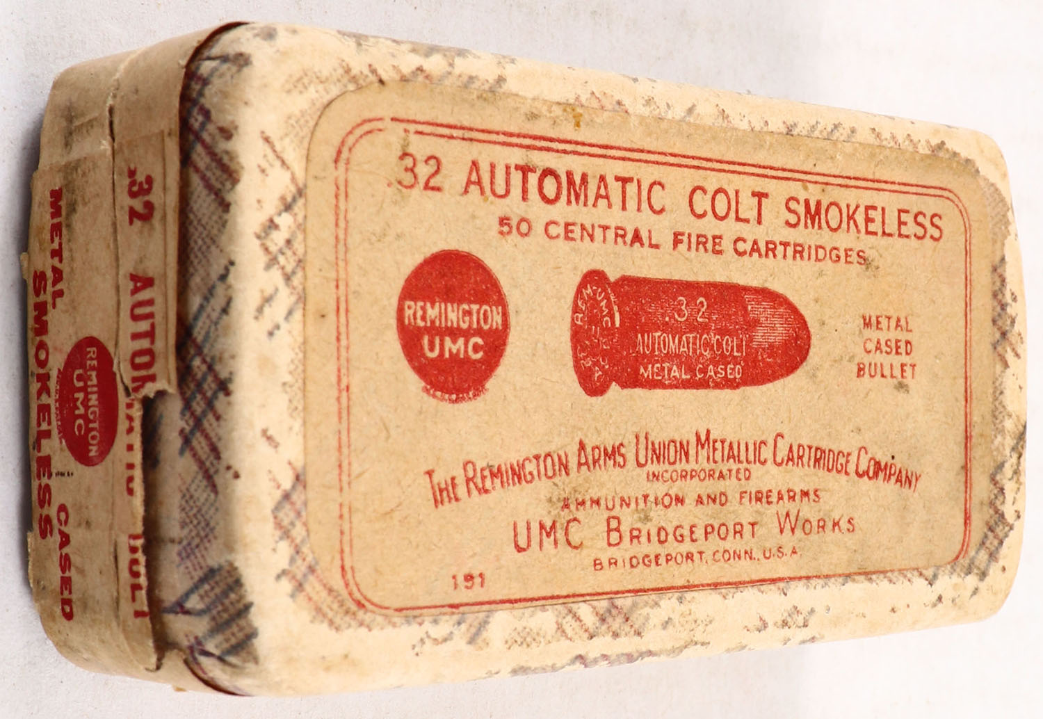 REM-UMC, Central Fire Cartridges, .32 Automatic Colt, Metal Cased Bullet, Full, 2pc. Purple fabric box with buff top & side sealing labels, box is solid with very good to excellent color, shelf wear, some edge & corner wear, labels are intact, ammo is excellent. Grade: Very Good ++ - Value: 16 to 60