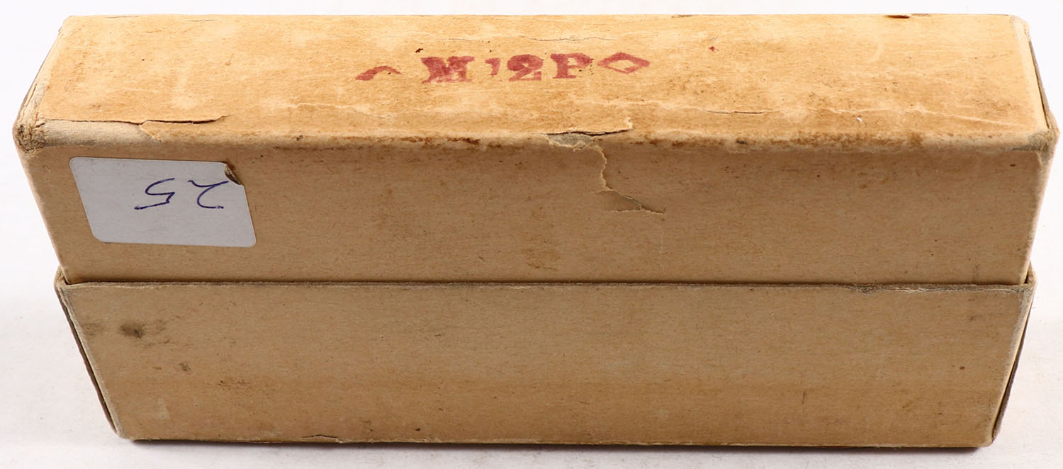 REM-UMC, Central Fire Cartridges, .257 Remington Roberts (.25 Roberts), Hi-Speed Mushroom, 87 Grs. Bullet, Empty (Full of fired brass), 2pc. Buff box with buff label, box is solid with excellent color, very minor age soiling & shelf wear, very minor edge & corner wear, label is intact, brass is excellent. Grade: Very Good + - Value: 4 to 20