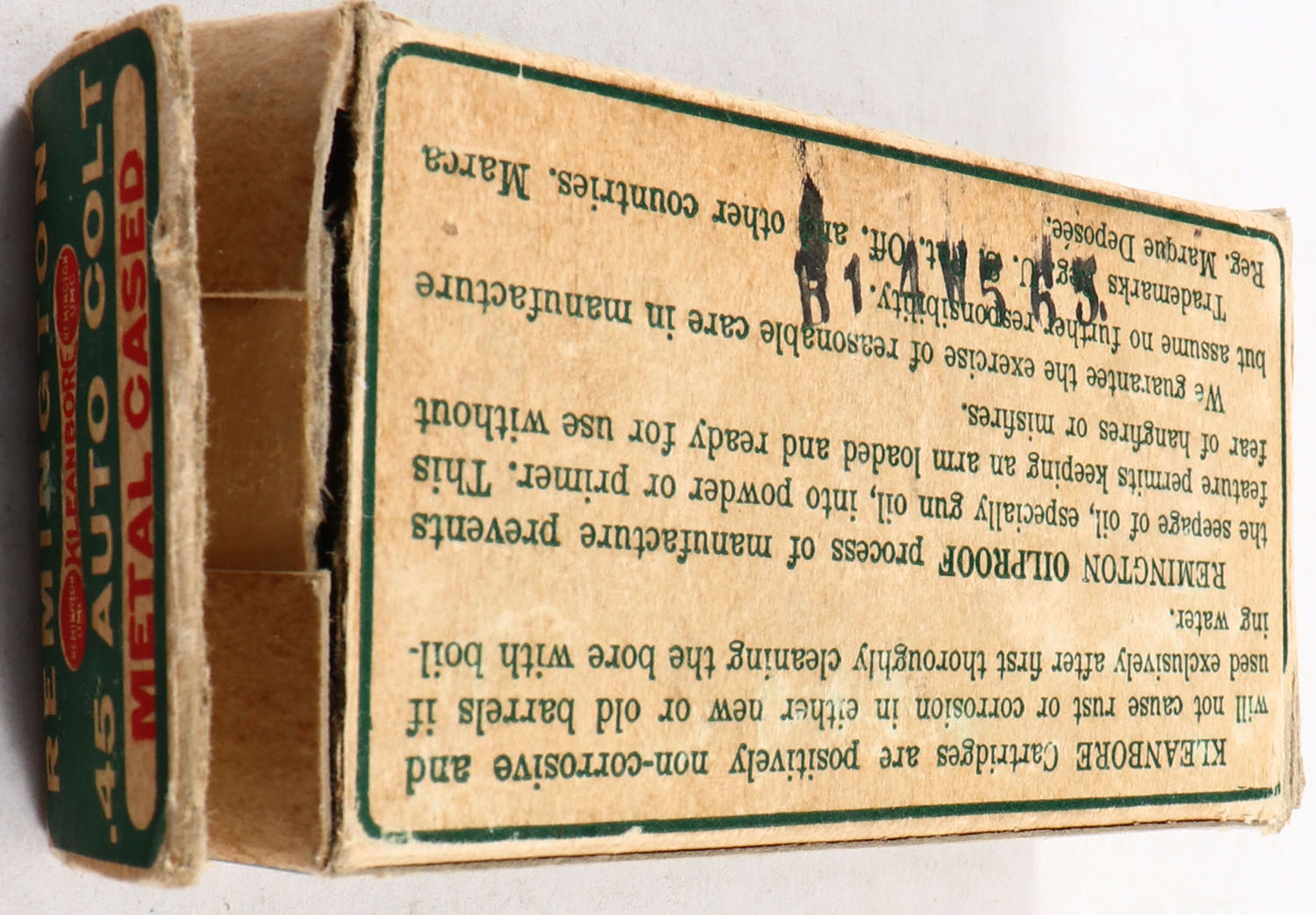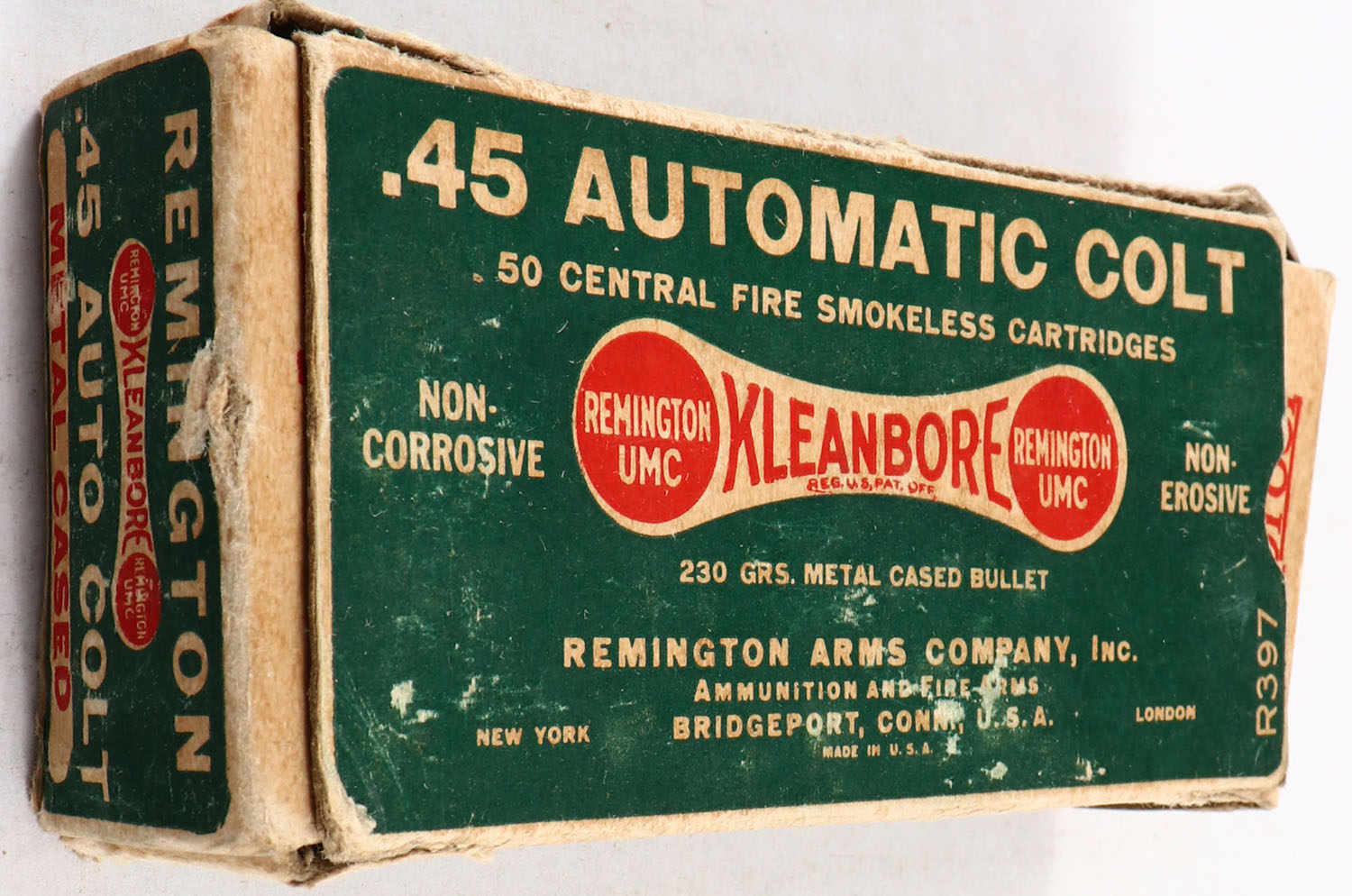 Remington, Kleanbore, .45 Automatic Colt, 230 Grain Metal Cased Bullet, Full, 1pc. Green buff & red dog bone box, box has seam splits, right end flap is torn, has edge & corner wear, ammo is very good. Grade: Very Good - Value: 20 to 100