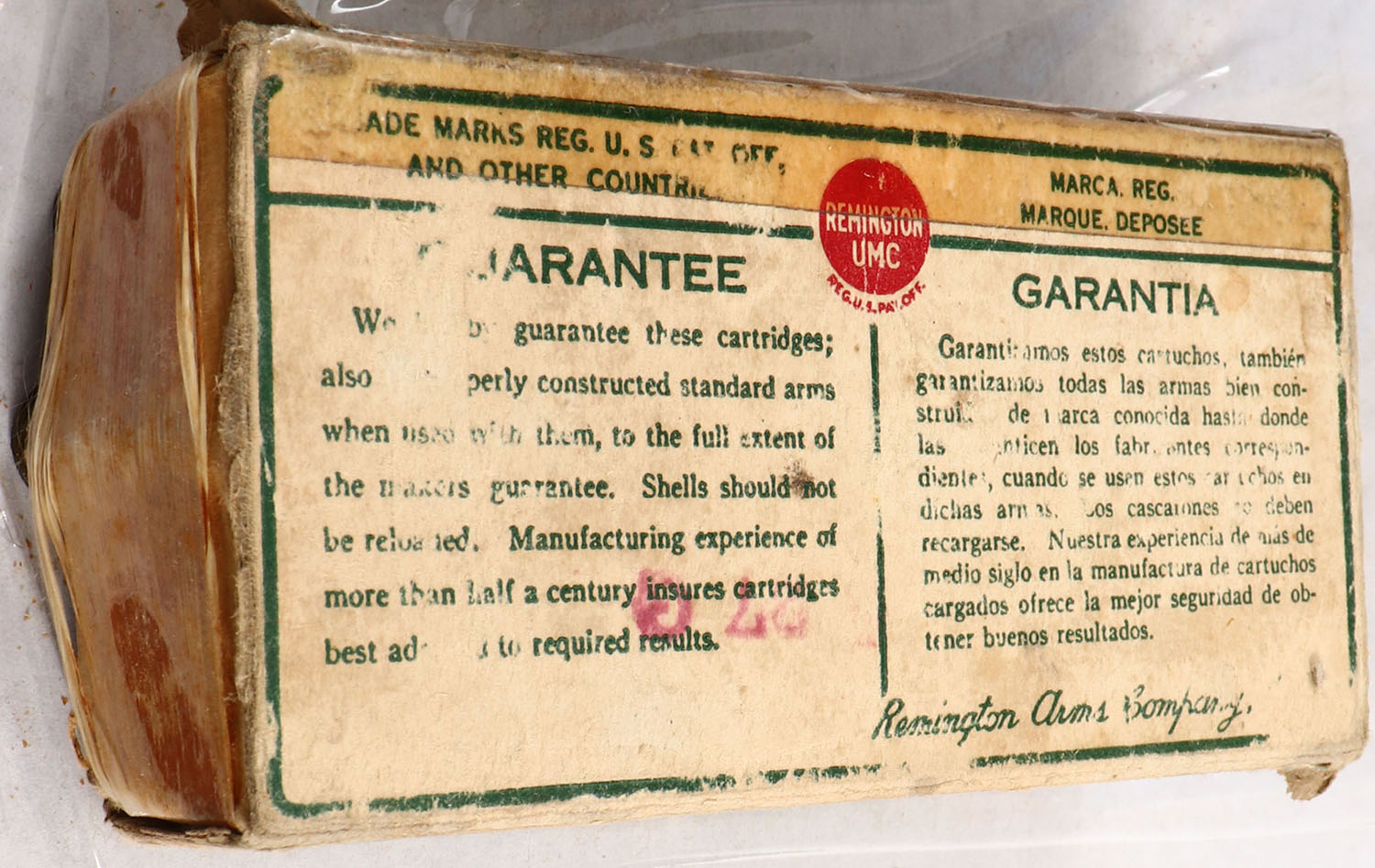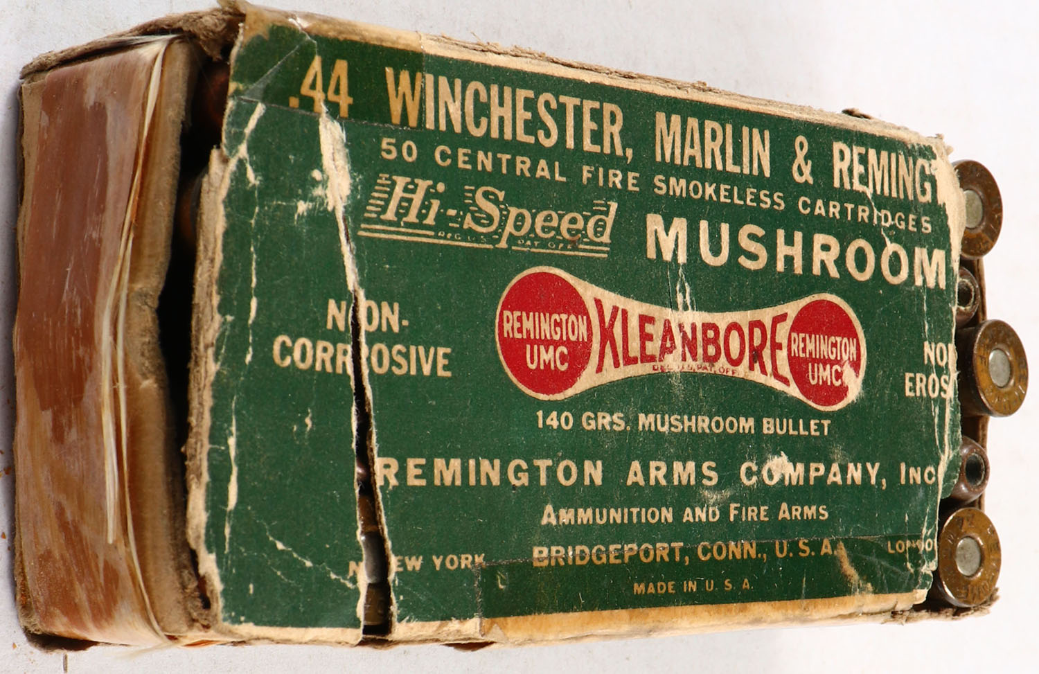Remington, Kleanbore Hi-Speed, .44 Winchester, 140 Grs. Mushroom Bullet, Full, 1pc. Green white & red dog bone box, both end flaps are torn, has seam splits with tape repairs, edge & corner wear, ammo is good. Grade: Good - Value: 20 to 100