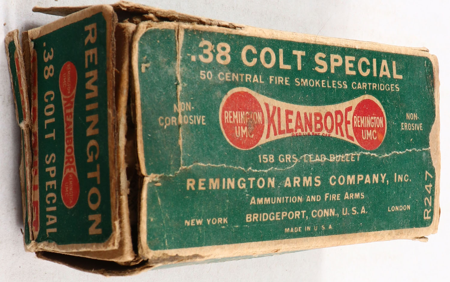 Remington, Kleanbore, .38 Colt Special, 158 Grain Lead Bullet, Partial 36rds, 1pc. Green buff & red dogbone box, box has seam splits, some age soiling & shelf wear, some corner wear, very minor edge wear, end flaps are solid, ammo is good. Grade: Good - Value: 8 to 30