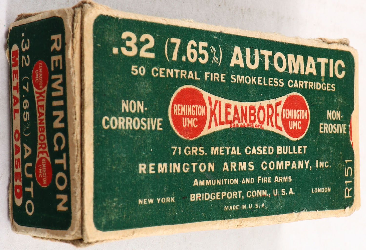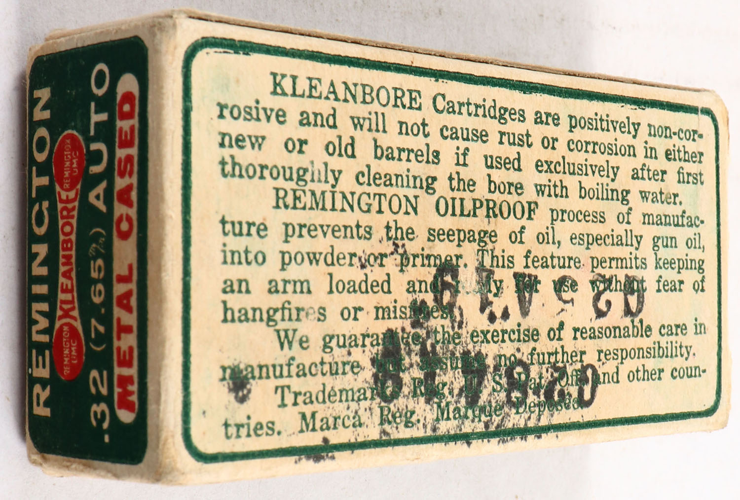 Remington Kleanbore, .32 (7.65) Automatic, 71 Gr. Metal Cased Bullet, 1pc, Full, buff box with green label & white/red print, box has seam split, has light edge & corner wear, ammo is excellent. Grade: Very Good ++ - Value: 20 to 40
