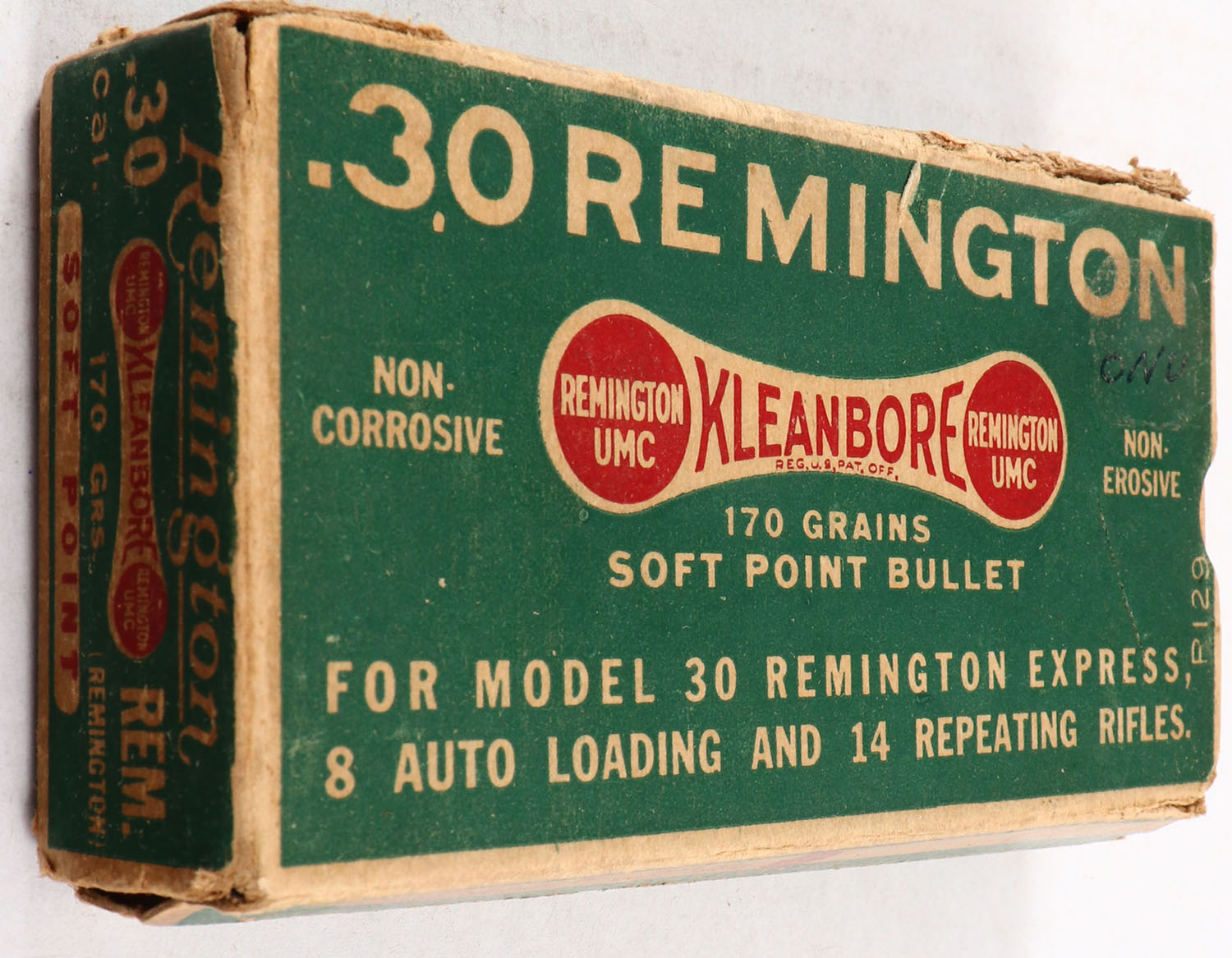 Remington, Kleanbore, .30 Remington, 170 Gr. Soft Point, Full, 1pc. Green white & red dog bone box, right end flap is torn, box has seam splits with scuffing, edge & corner wear, ammo is very good. Grade: Good - Value: 20 to 60