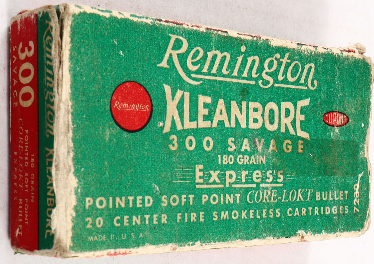 Remington, Kleanbore Express, .300 Savage, 180 Grain Pointed Soft Point Core-Lokt Bullet, Full, 1pc. Green white & red box, box is solid with good color, has age soiling with edge & corner wear, right end flap is missing, ammo is excellent. Grade: Good ++ - Value: 20 to 60