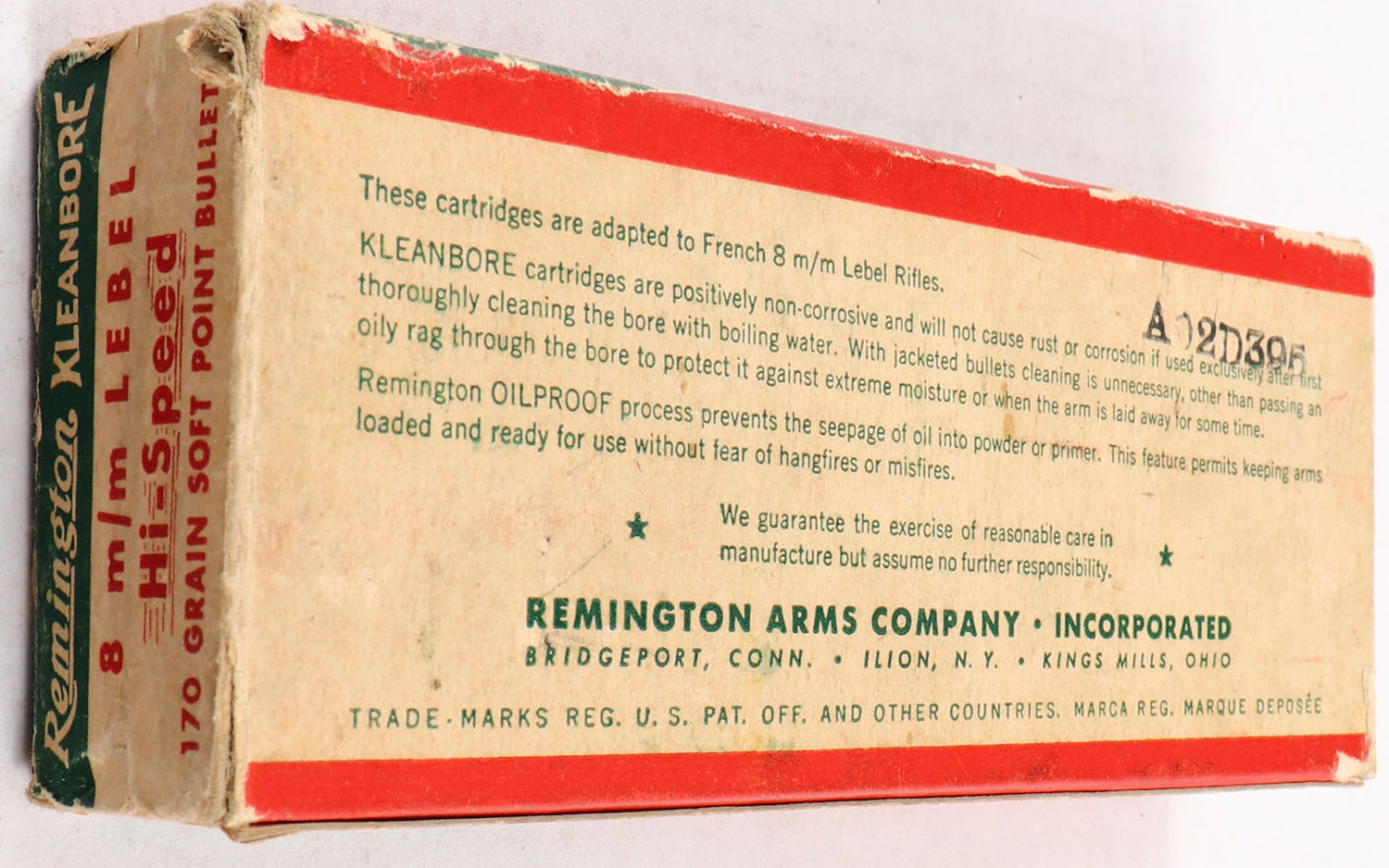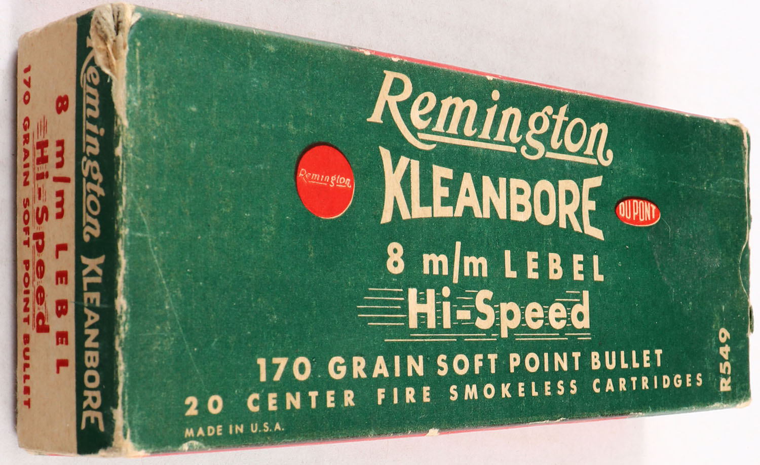 Remington, Kleanbore Hi-Speed, 8mm Lebel 170 Grain Soft Point Bullet, Full, 1pc. Green white & red box, box is solid with excellent color, very minor age soiling & shelf wear, has corner wear with minor edge wear, end flaps are solid, ammo is very good. Grade: Very Good ++ - Value: 20 to 60