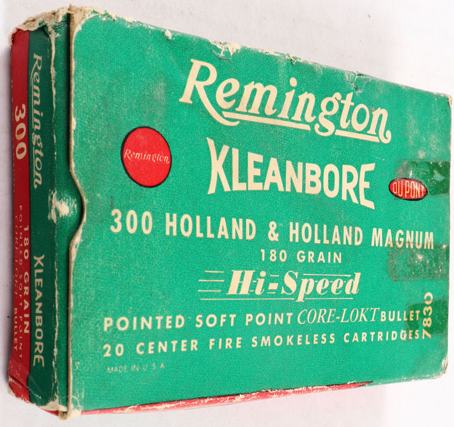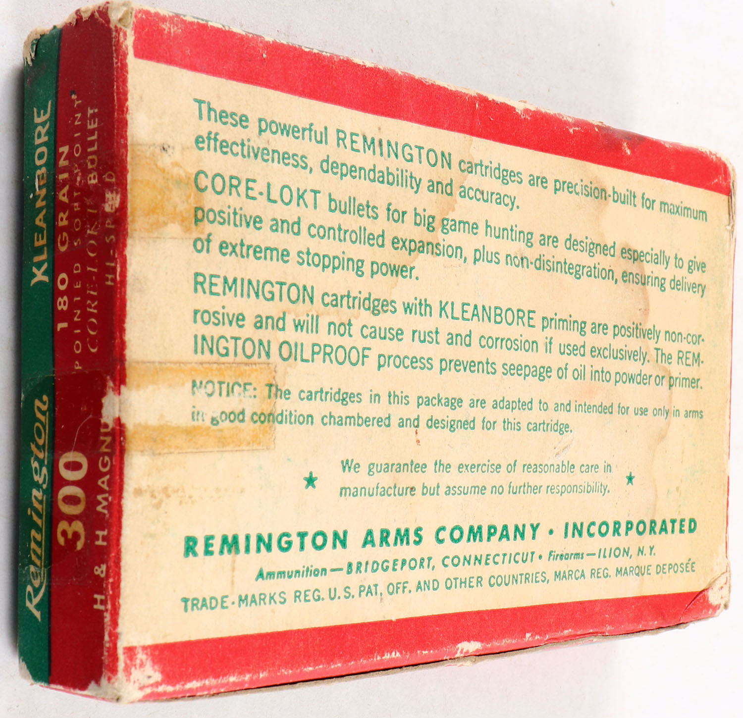 Remington, Kleanbore, .300 H&H Magnum, Express, 180 Gr. Soft Point Core-Lokt bullet, 1pc, Full, Green, red, & white box, box has age soiling with scuffing, edge wear, & corner wear, ammo is very good. Grade: Very Good - Value: 20 to 60
